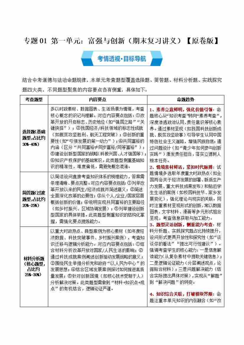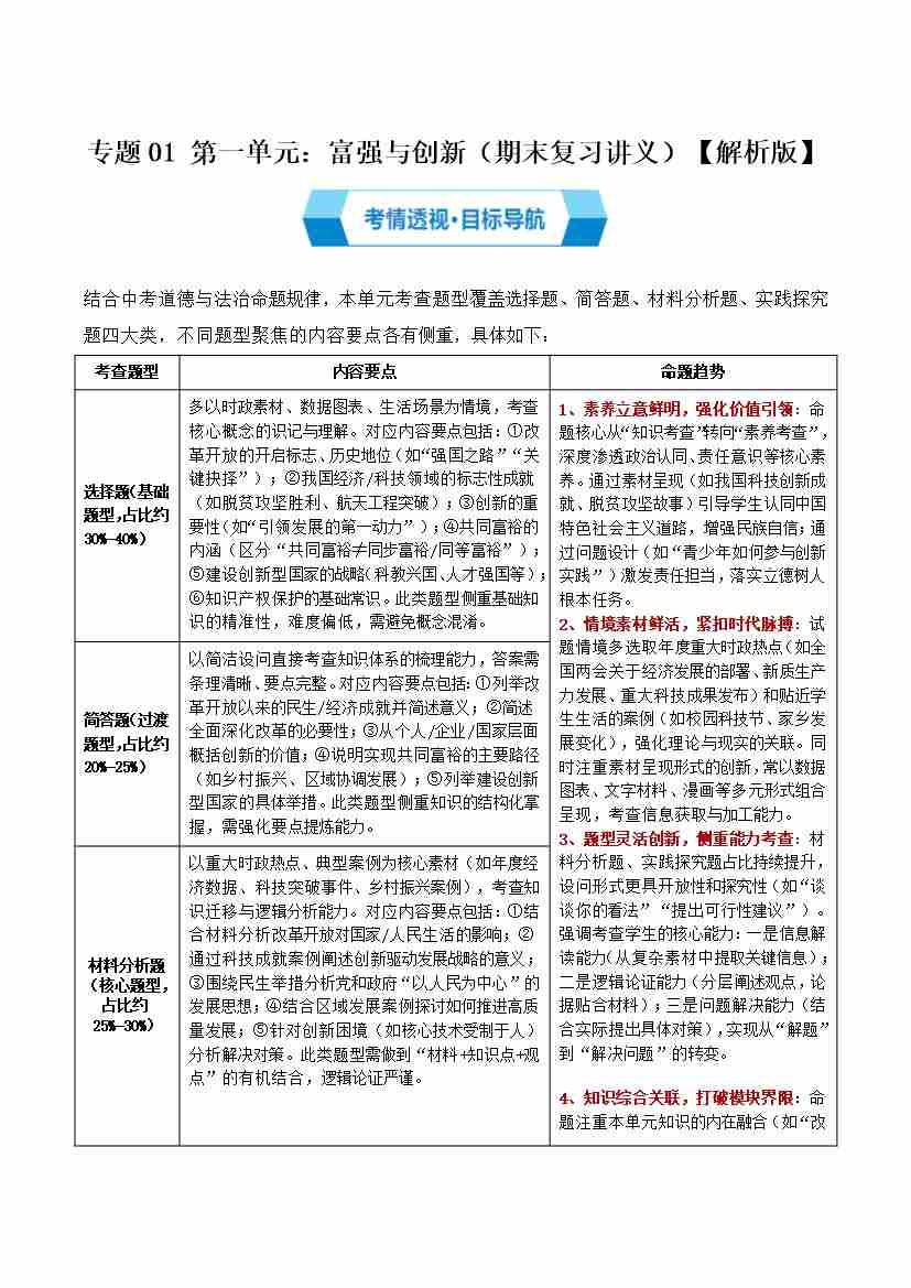 第一单元 富强与创新(期末复习讲义)(教师版)