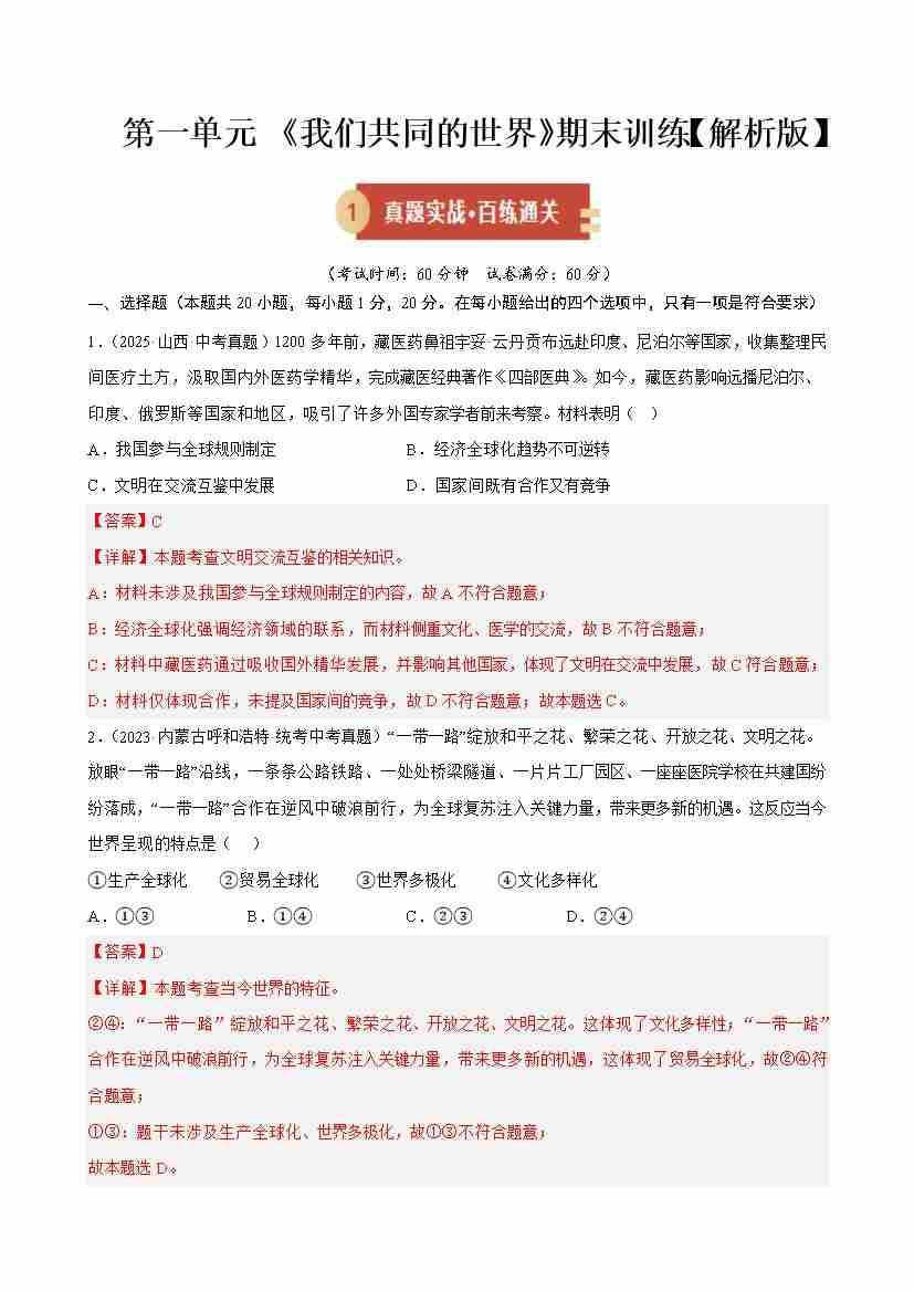 第一单元 我们共同的世界(期末专项训练)(解析版)