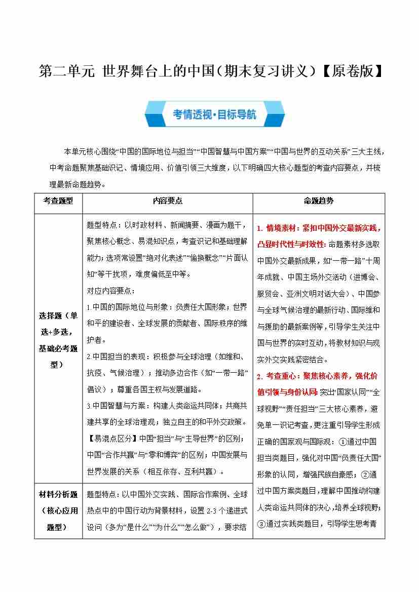 第二单元 世界舞台上的中国(期末复习讲义)(学生版)
