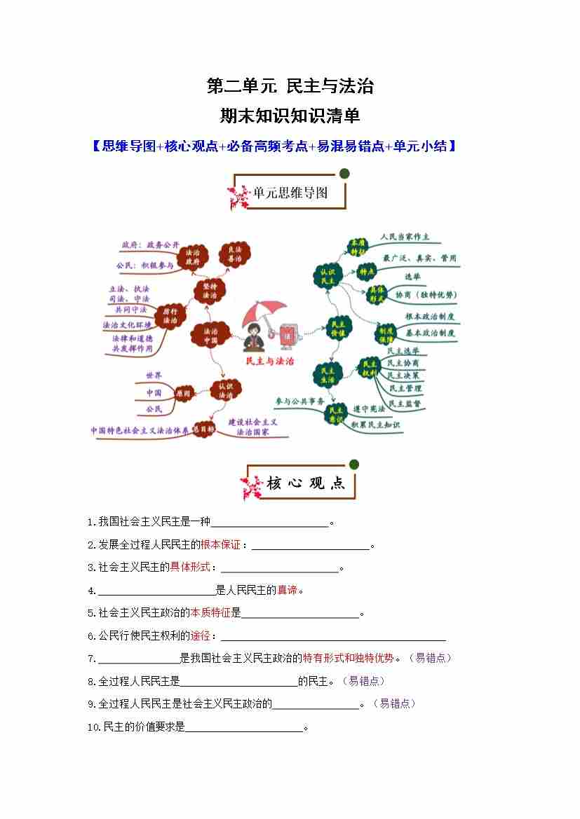 第二单元 民主与法治(期末复习知识清单)(原卷版)