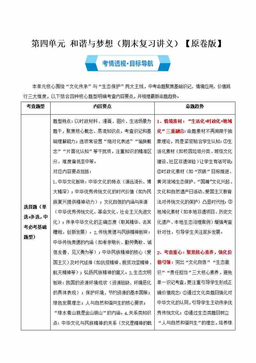 第四单元 和谐与梦想(期末复习讲义)(原卷版)