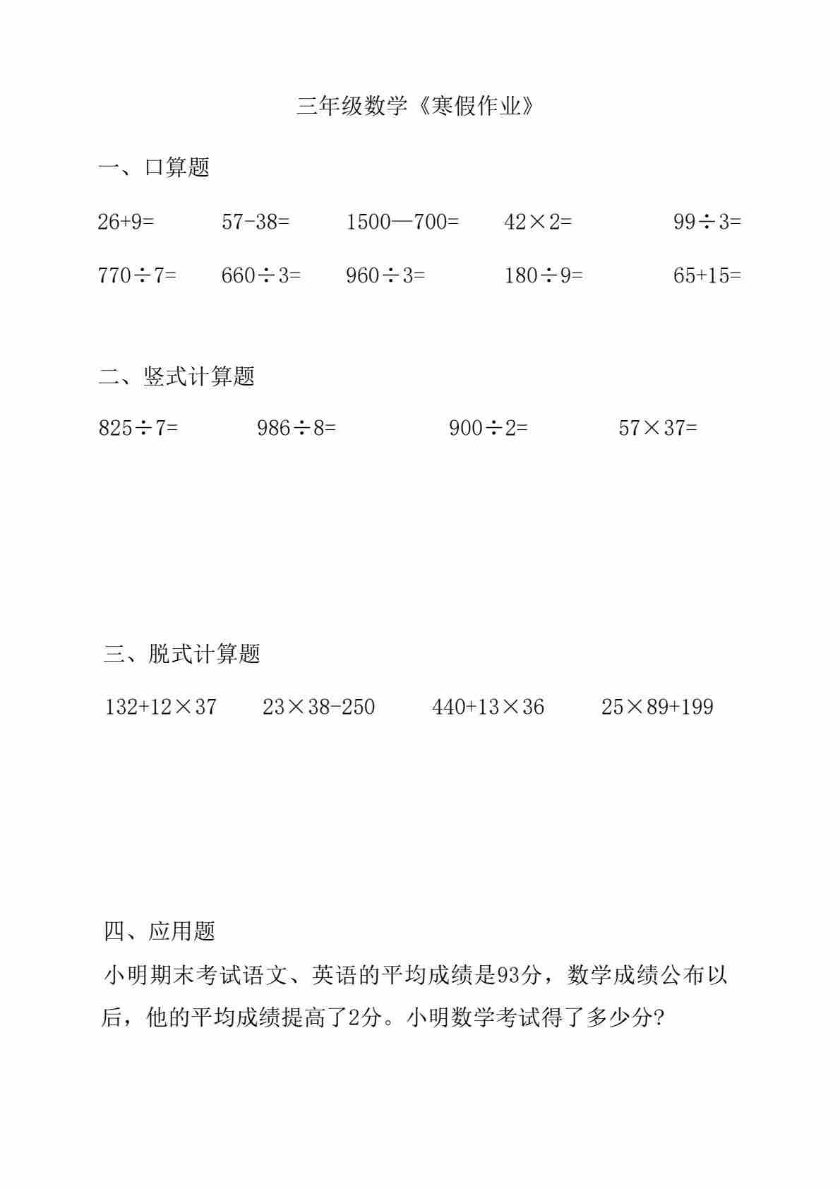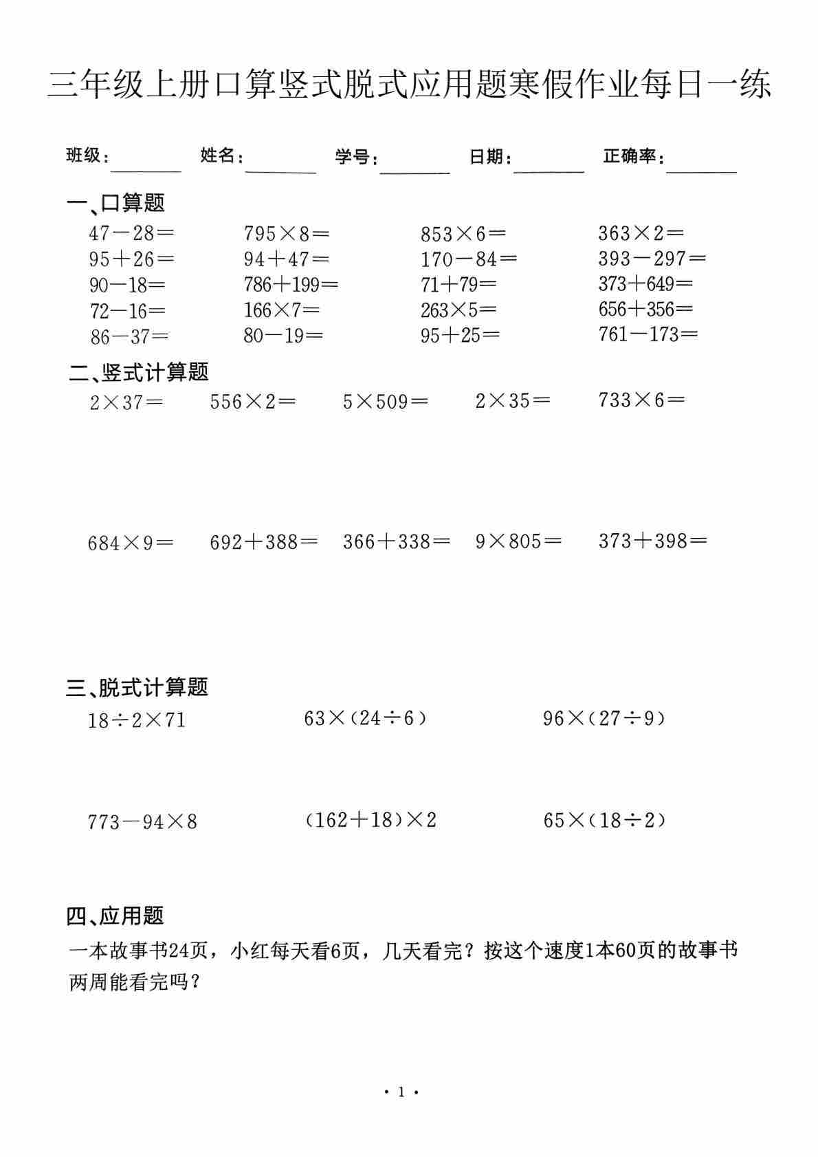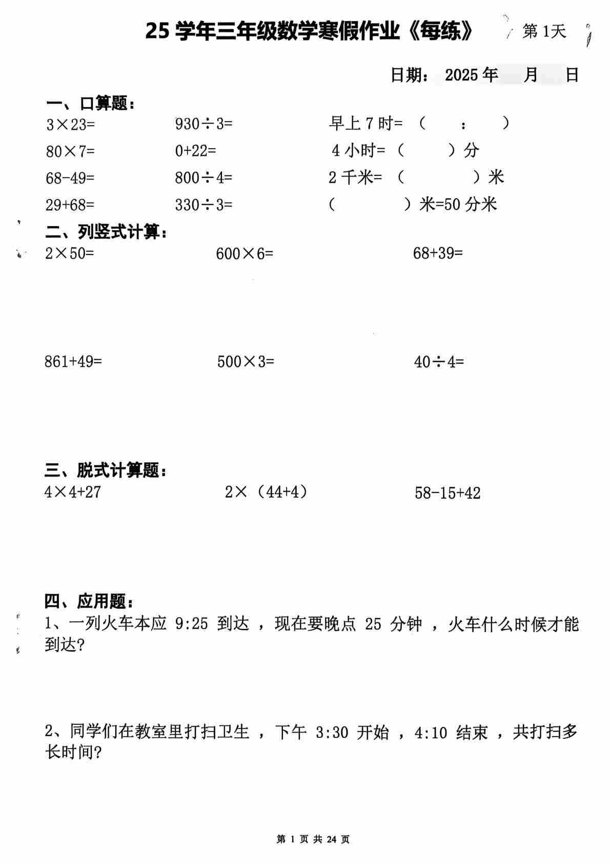三年级上口算竖式脱式应用题寒假作业每日一练
