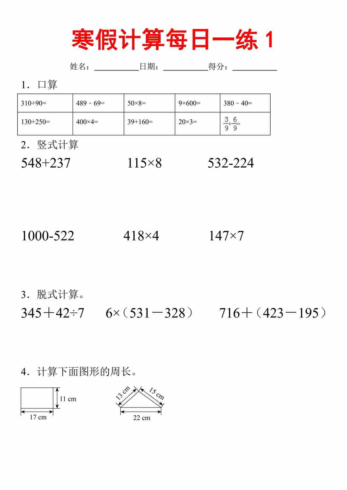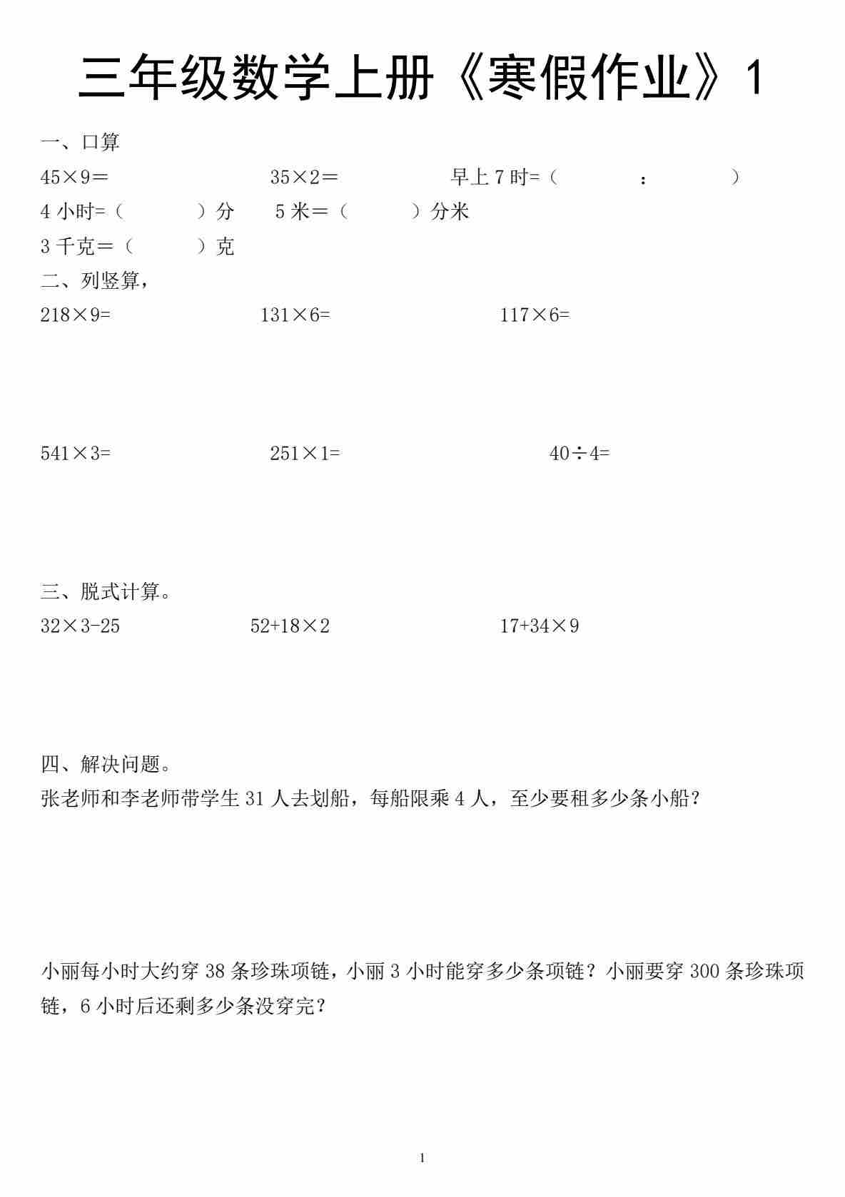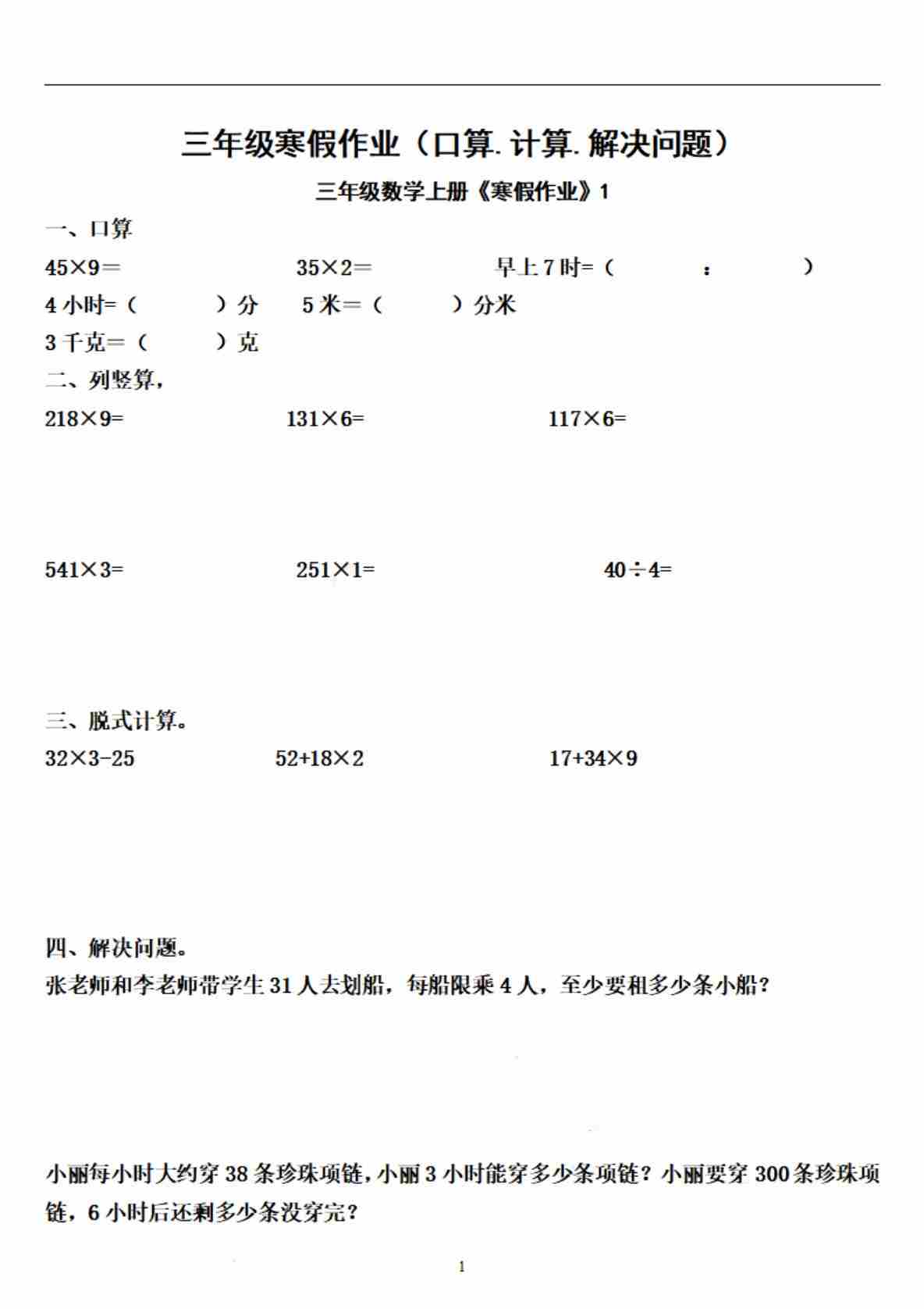 三年级上口算竖式脱式应用题寒假作业每日一练