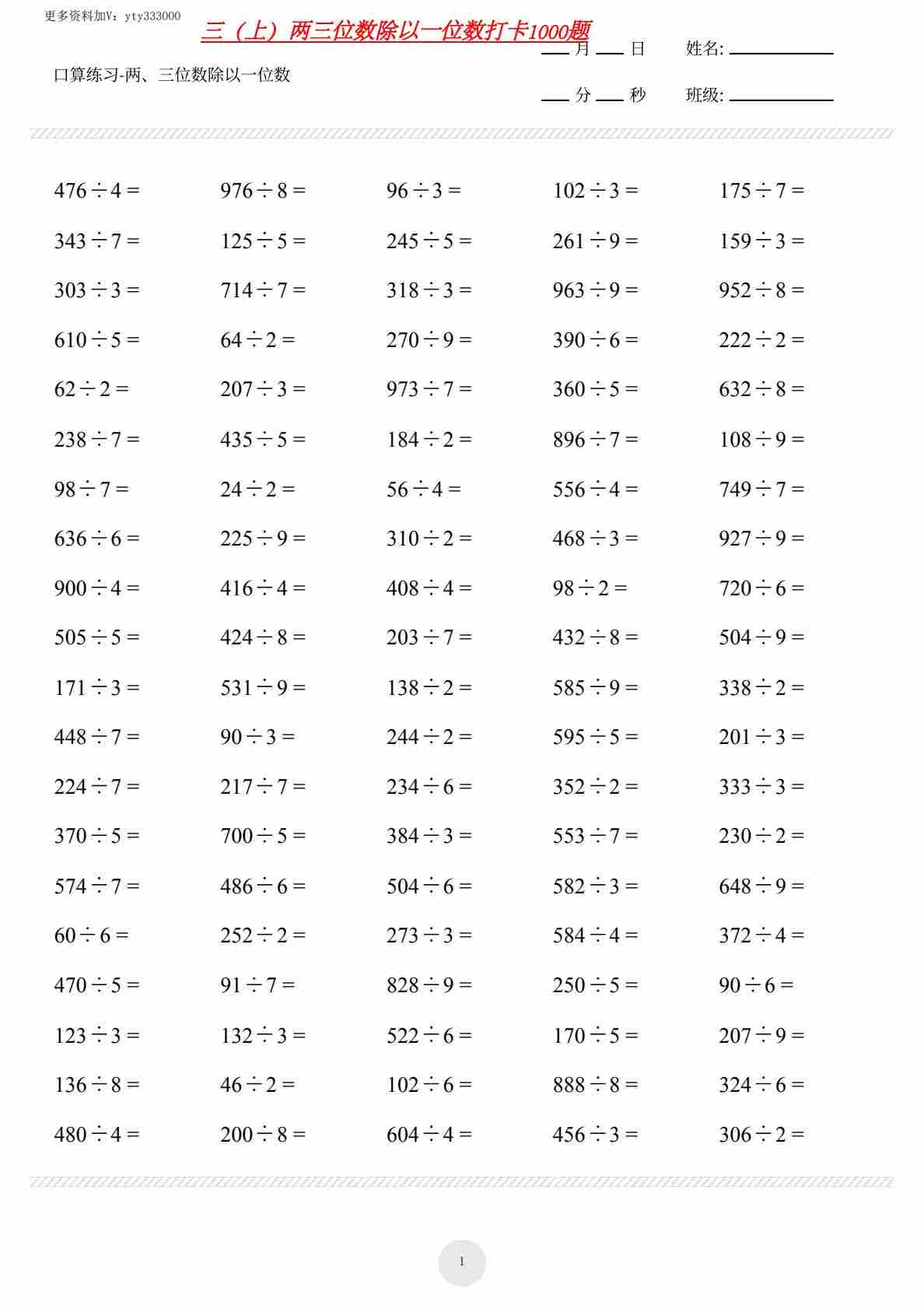 三年级数学寒假《两三位数除以一位数1000题》1.31