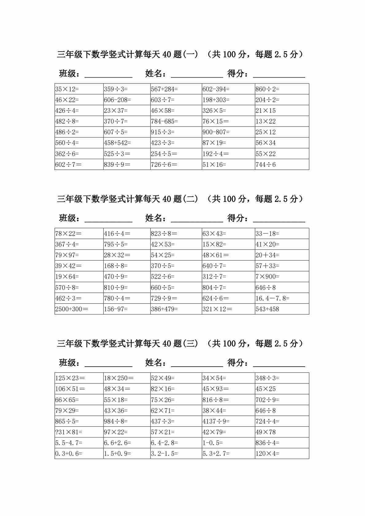 三年级数学寒假《竖式计算》每天40题
