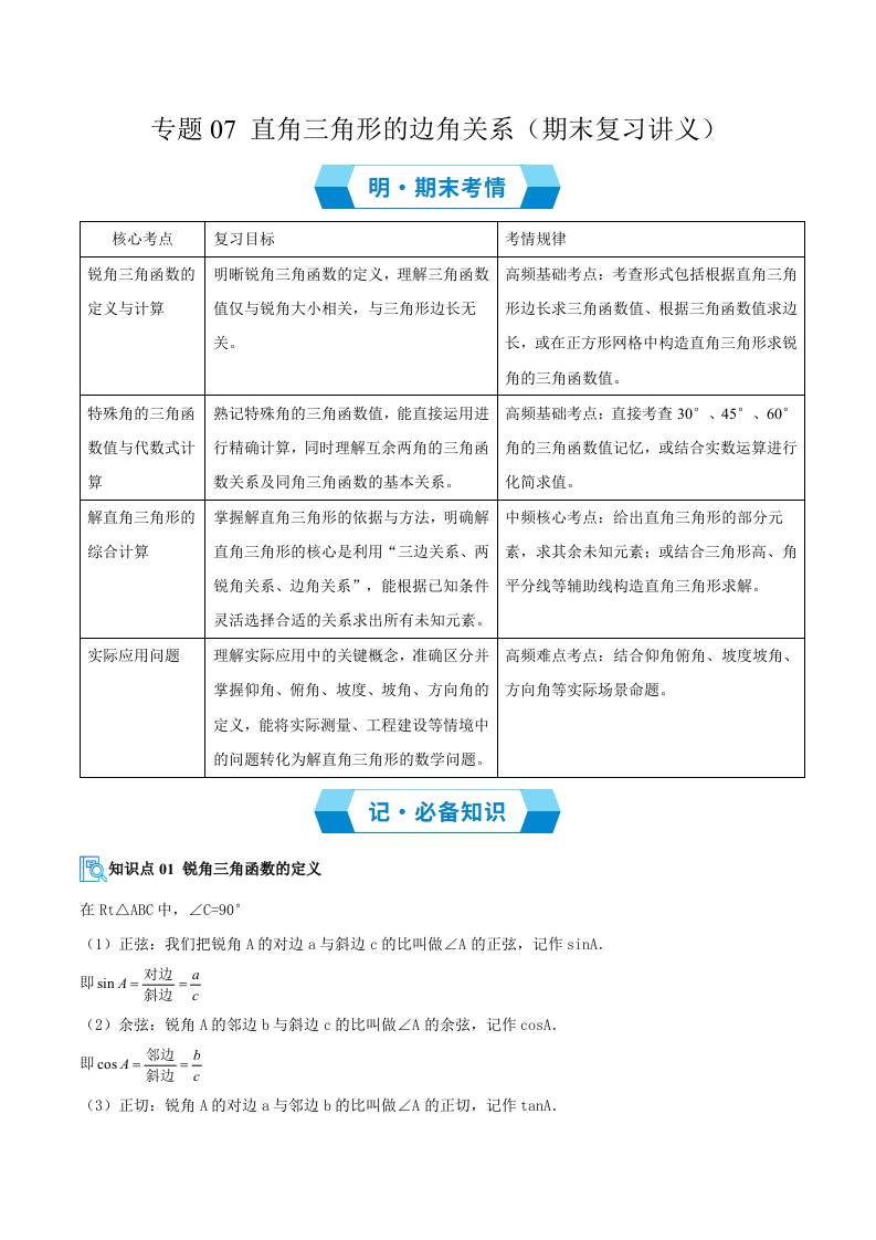 专题07 直角三角形的边角关系(知识必备6大重难题型过关验收)(期末复习讲义)解析版