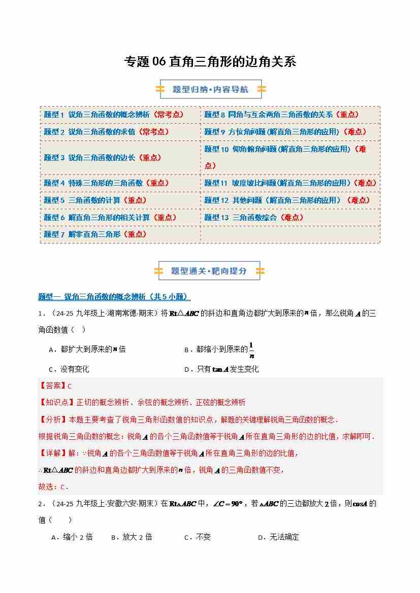 专题07 直角三角形的边角关系(知识必备6大重难题型过关验收)(期末复习讲义)原卷版