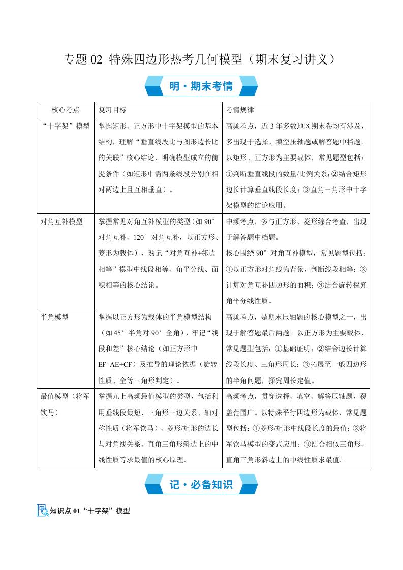专题02 特殊四边形热考几何模型(知识必备4大重难题型过关验收)(期末复习讲义)原卷版