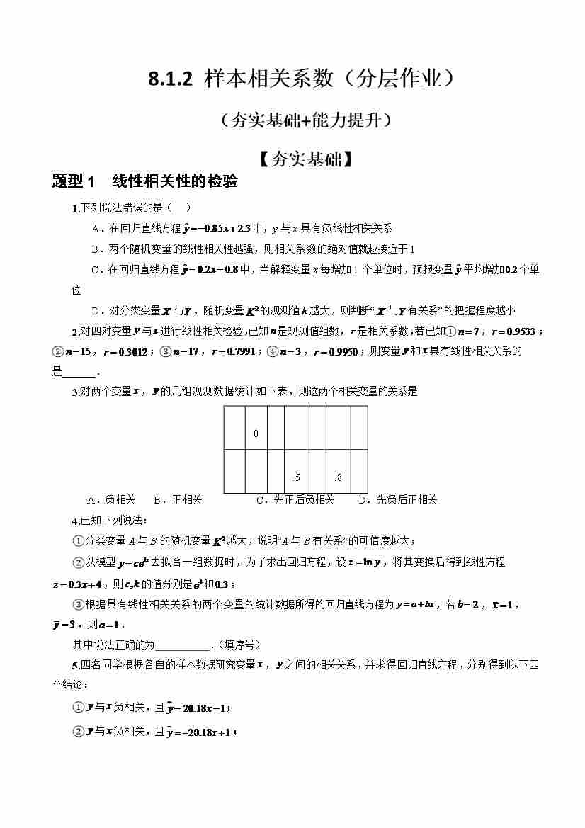 8.1.2 样本相关系数(分层作业)(原卷版)