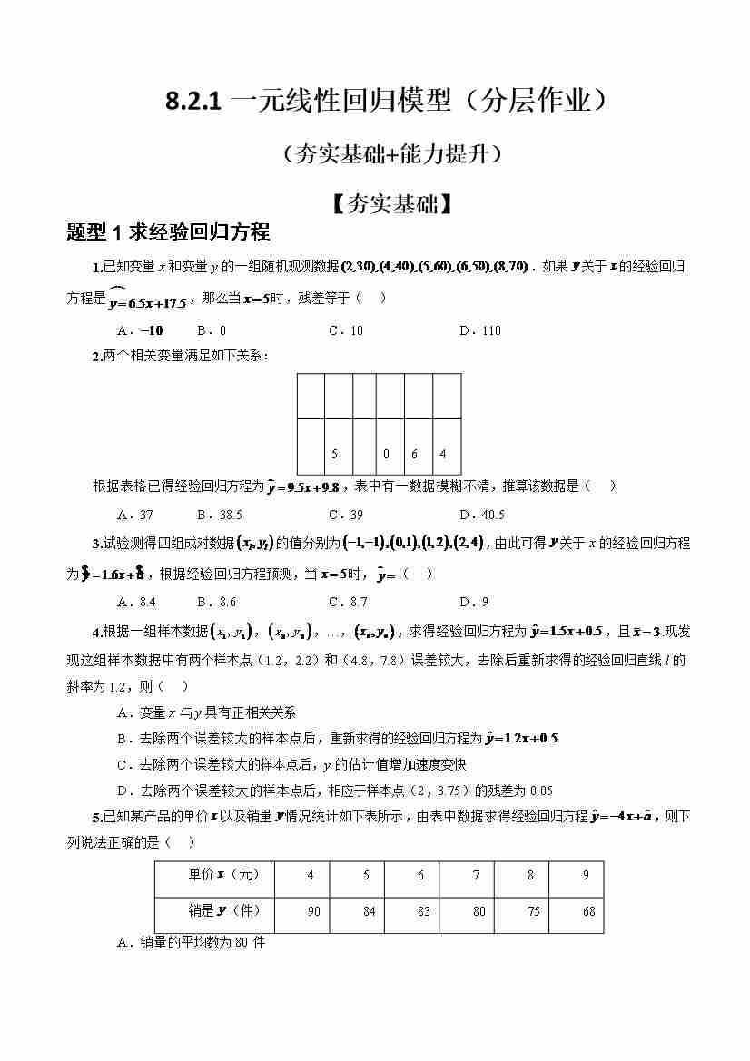 8.2.1一元线性回归模型 (分层作业)(原卷版)
