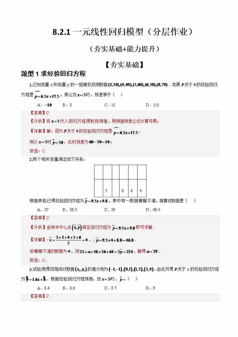 8.2.1一元线性回归模型 (分层作业)(解析版)