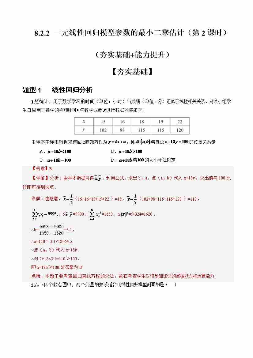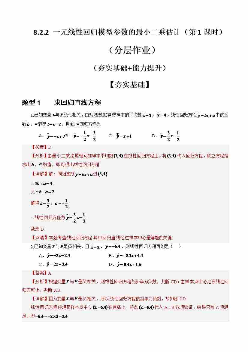 8.2.2 一元线性回归模型参数的最小二乘估计 (第2课时) (分层作业)(解析版)