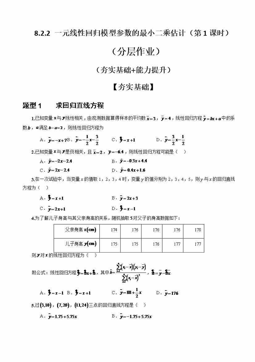8.2.2 一元线性回归模型参数的最小二乘估计(第1课时)(分层作业)(原卷版)