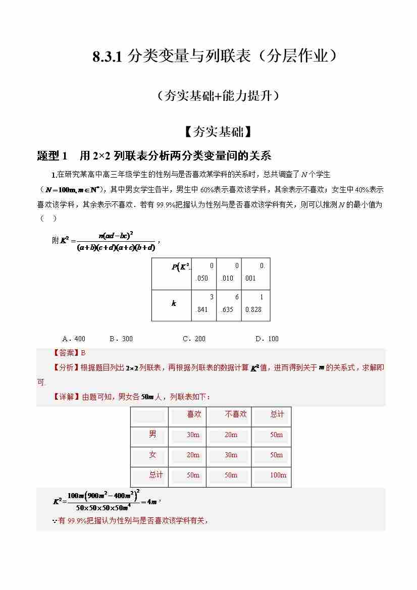 8.3.1分类变量与列联表(分层作业)(解析版)