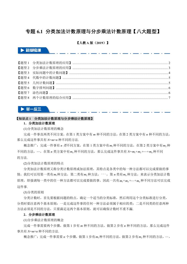专题6.1 分类加法计数原理与分步乘法计数原理(八大题型)(举一反三)(人教A版2019选择性必修第三册)(教师版)