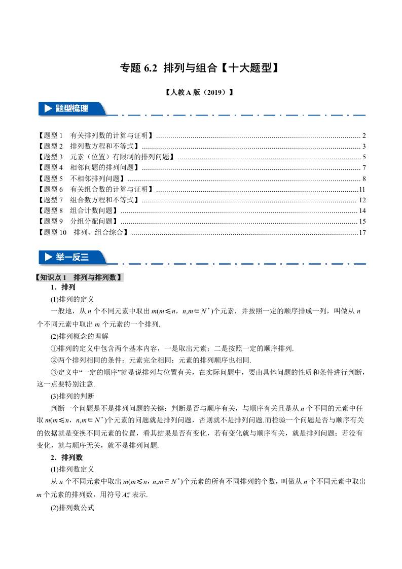 专题6.2 排列与组合(十大题型)(举一反三)(人教A版2019选择性必修第三册)(学生版)