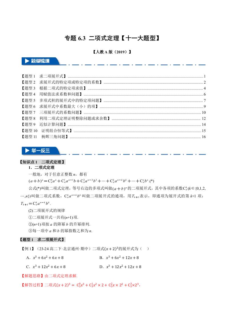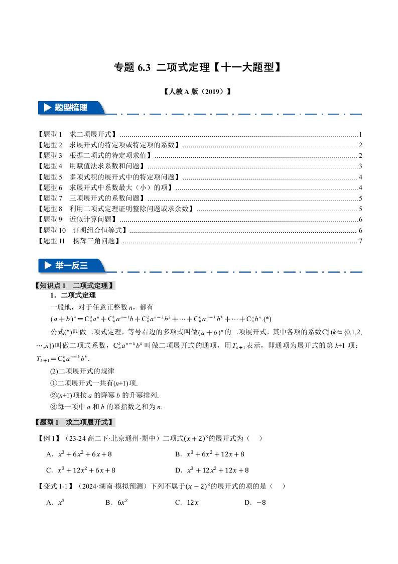 专题6.3 二项式定理(十一大题型)(举一反三)(人教A版2019选择性必修第三册)(学生版)