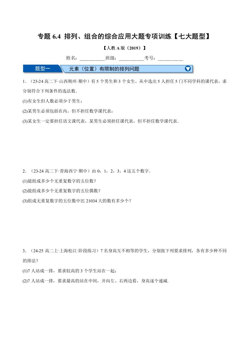 专题6.4 排列、组合的综合应用大题专项训练(七大题型)(举一反三)(人教A版2019选择性必修第三册)(学生版)