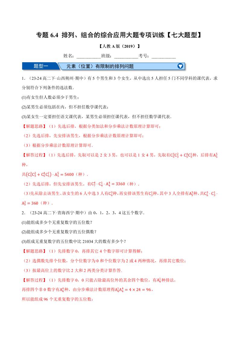 专题6.4 排列、组合的综合应用大题专项训练(七大题型)(举一反三)(人教A版2019选择性必修第三册)(教师版)