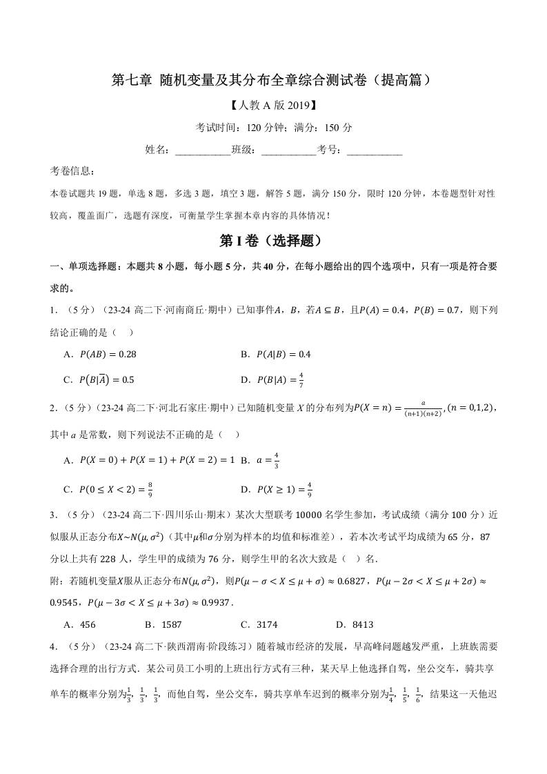 专题7.12 随机变量及其分布全章综合测试卷(提高篇)(人教A版2019选择性必修第三册)(学生版)
