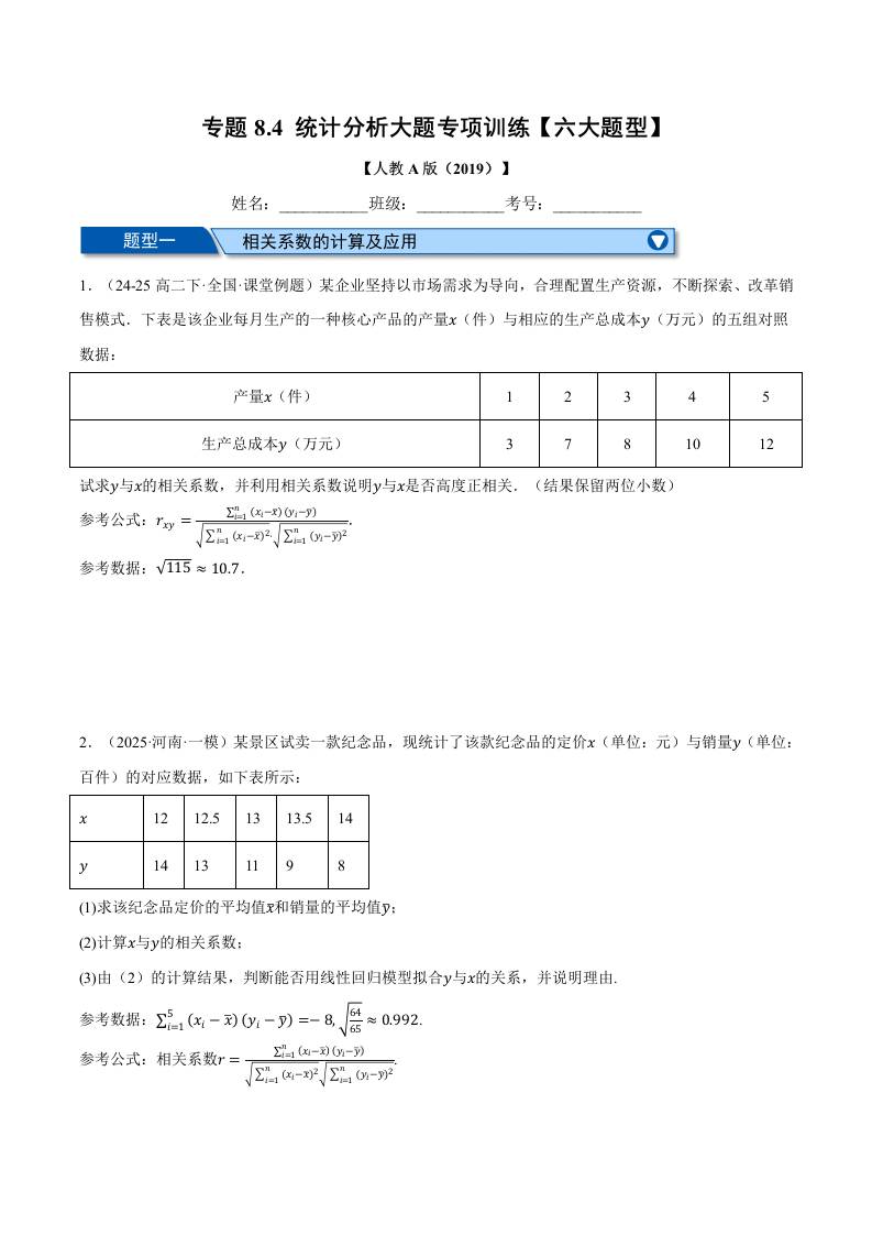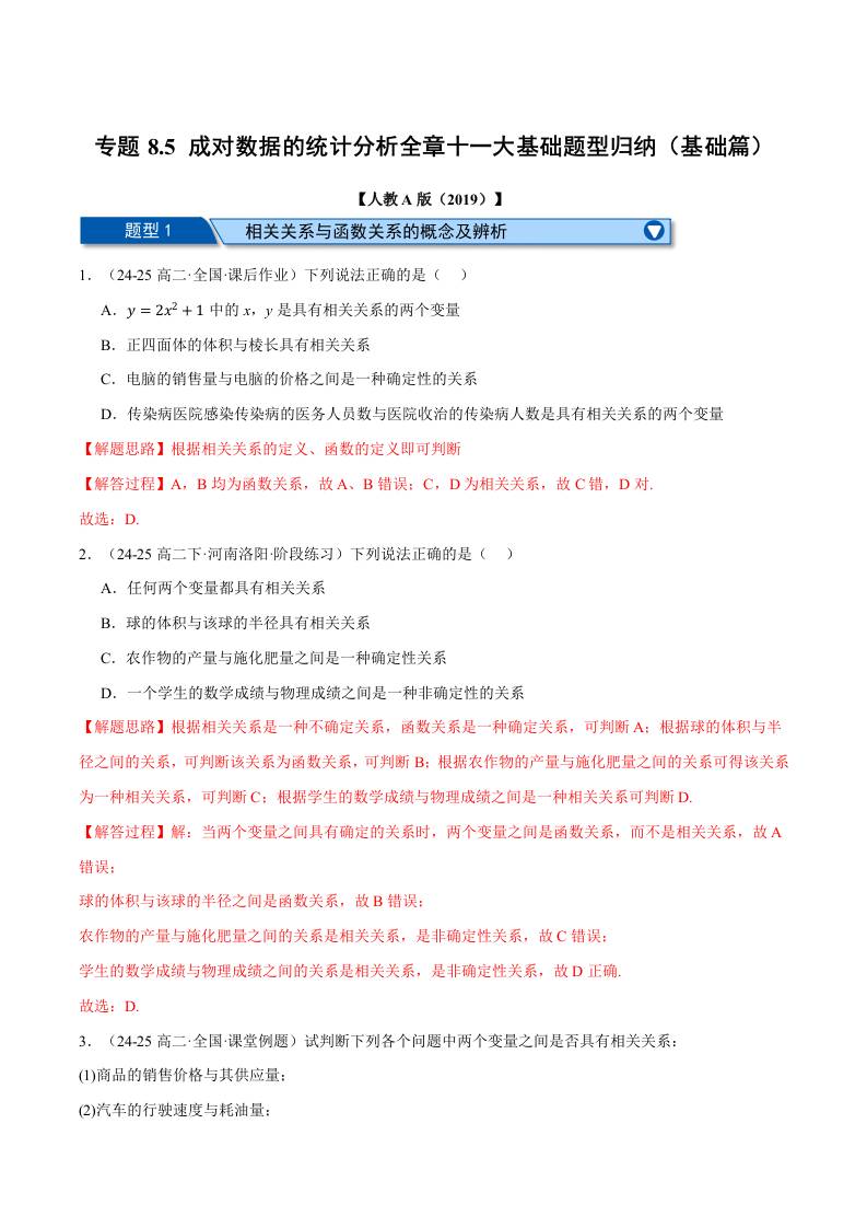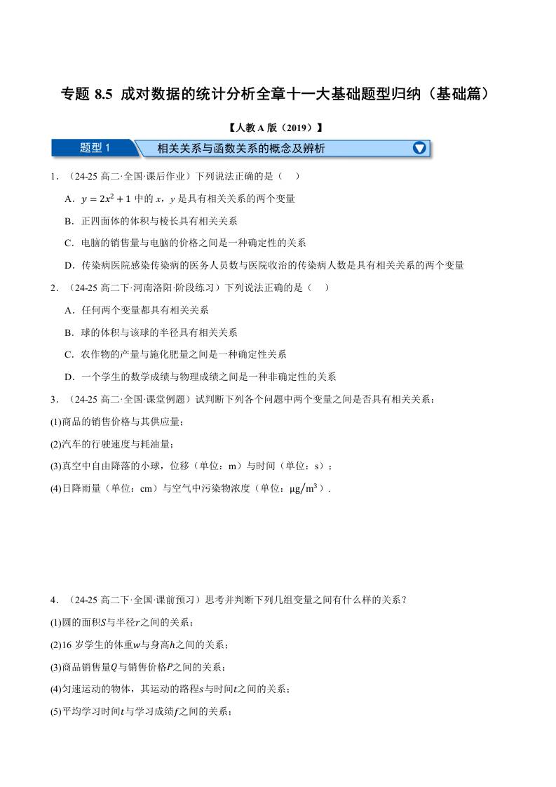 专题8.5 成对数据的统计分析全章十一大基础题型归纳(基础篇)(举一反三)(人教A版2019选择性必修第三册)(学生版)