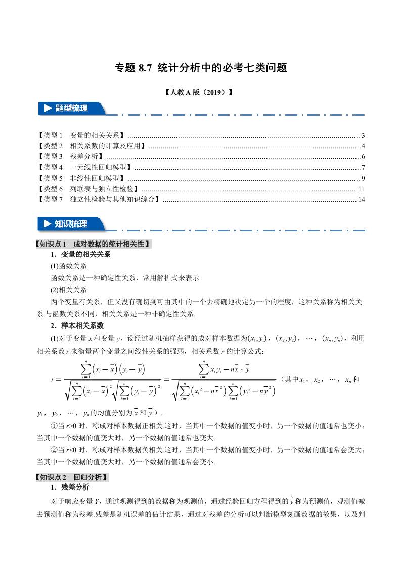 专题8.7 统计分析中的必考七类问题(举一反三)(人教A版2019选择性必修第三册)(学生版)