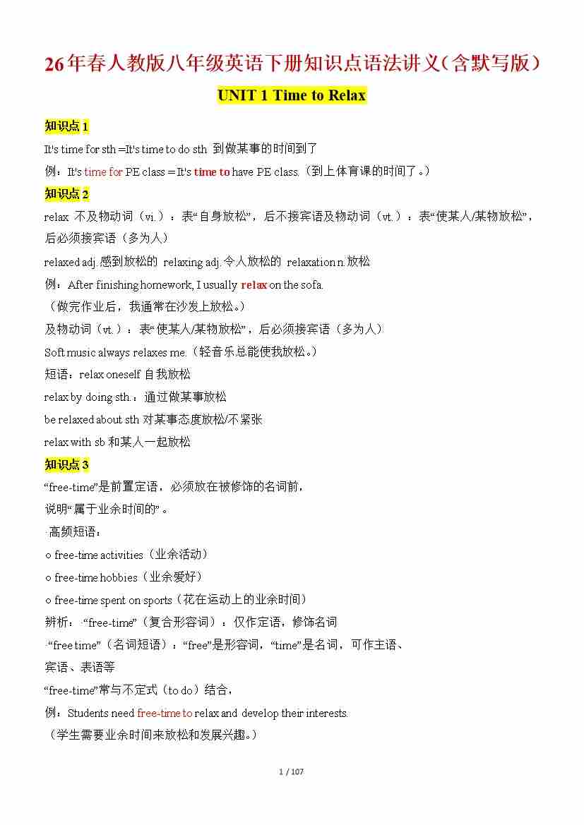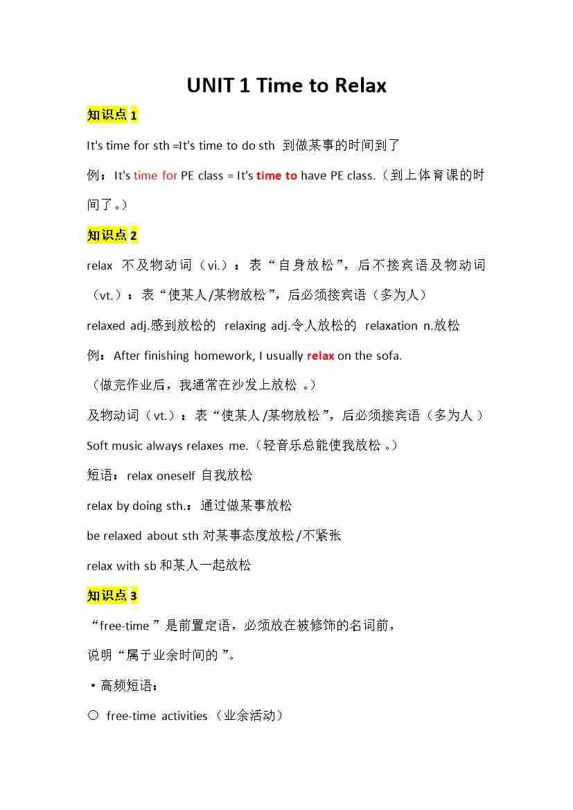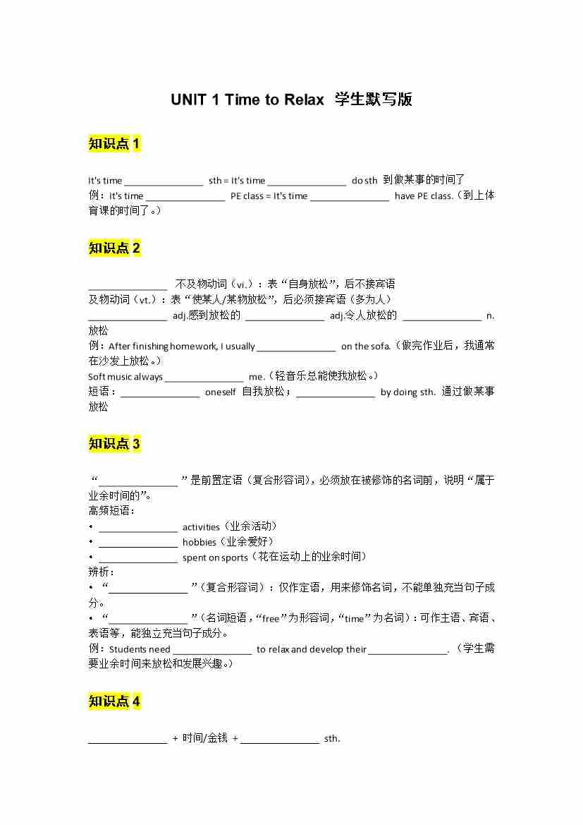 UNIT 1 Time to Relax 学生默写版