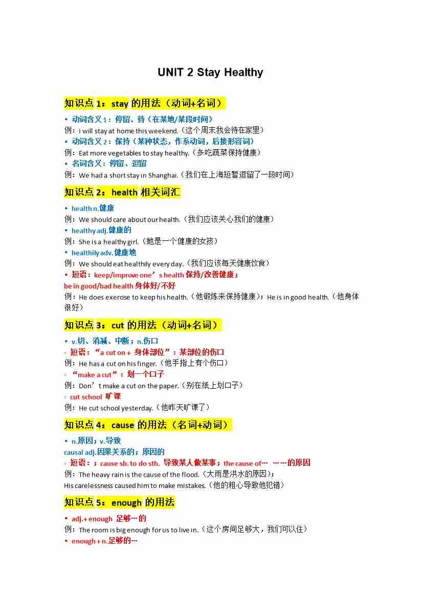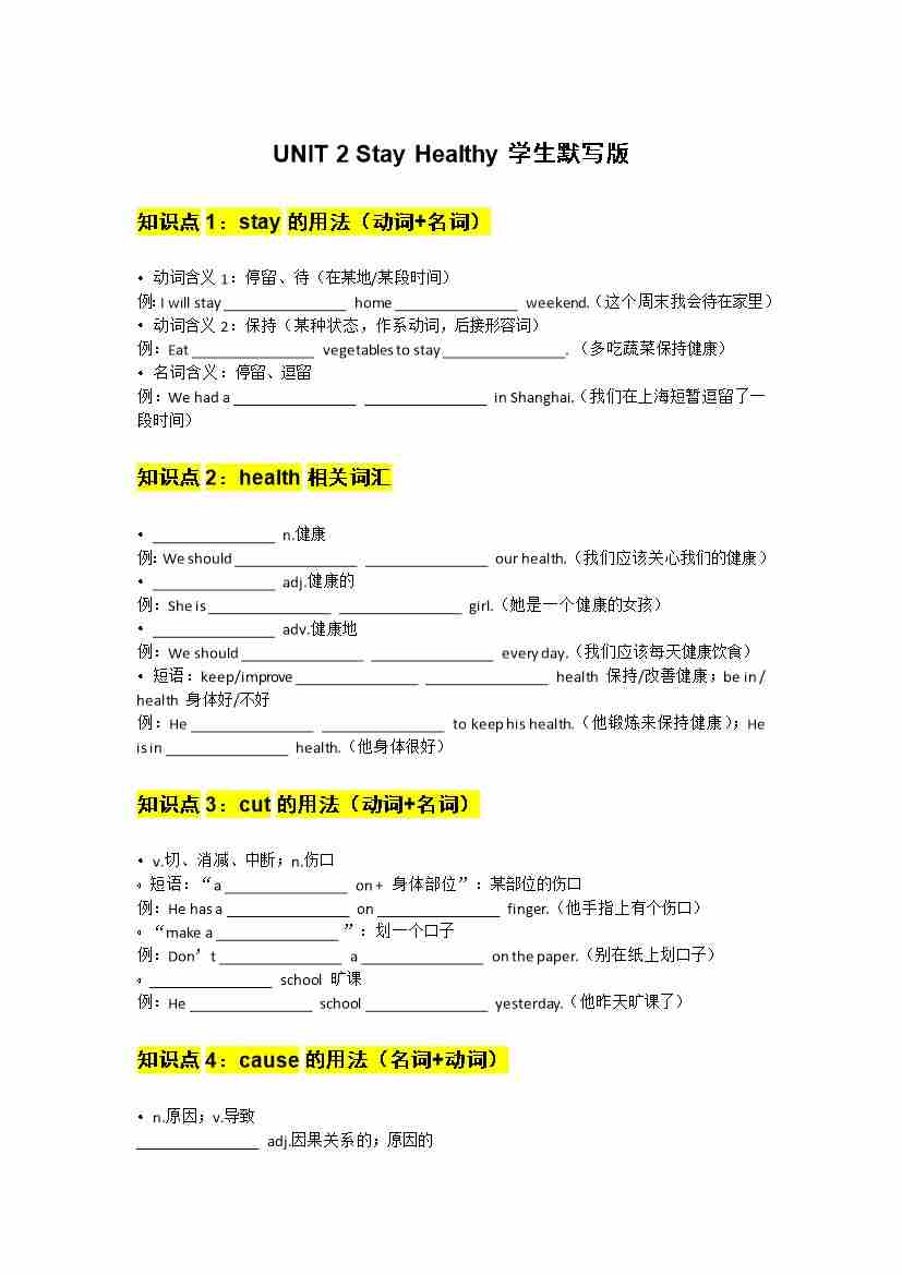 UNIT 2 Stay Healthy学生默写版