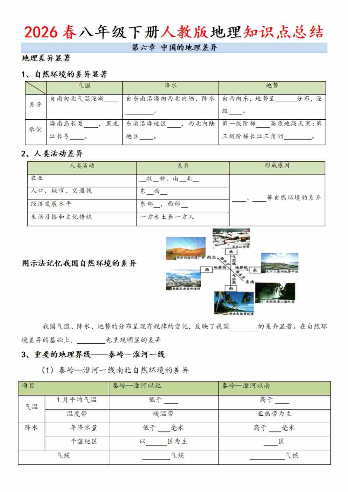 2026春八年级下册人教版地理知识点总结 - 填空版
