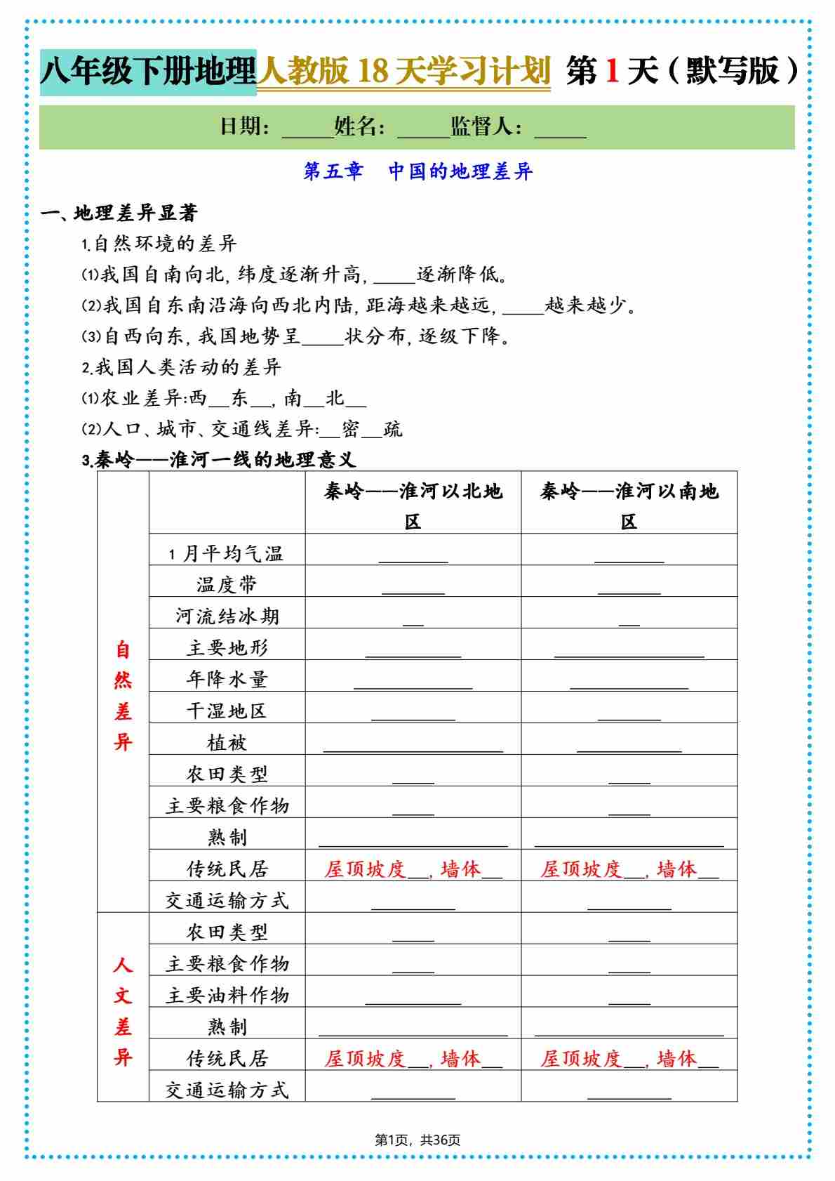 八年级下册地理人教版18天学习计划(1)