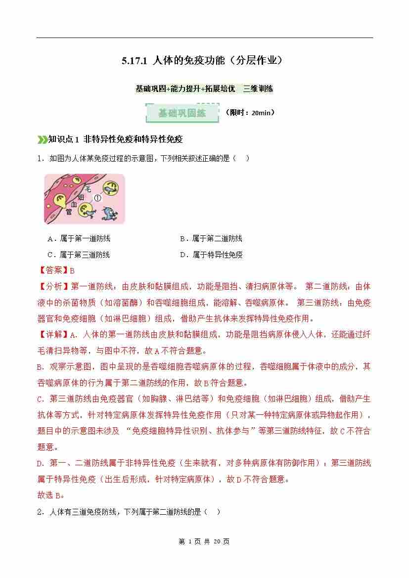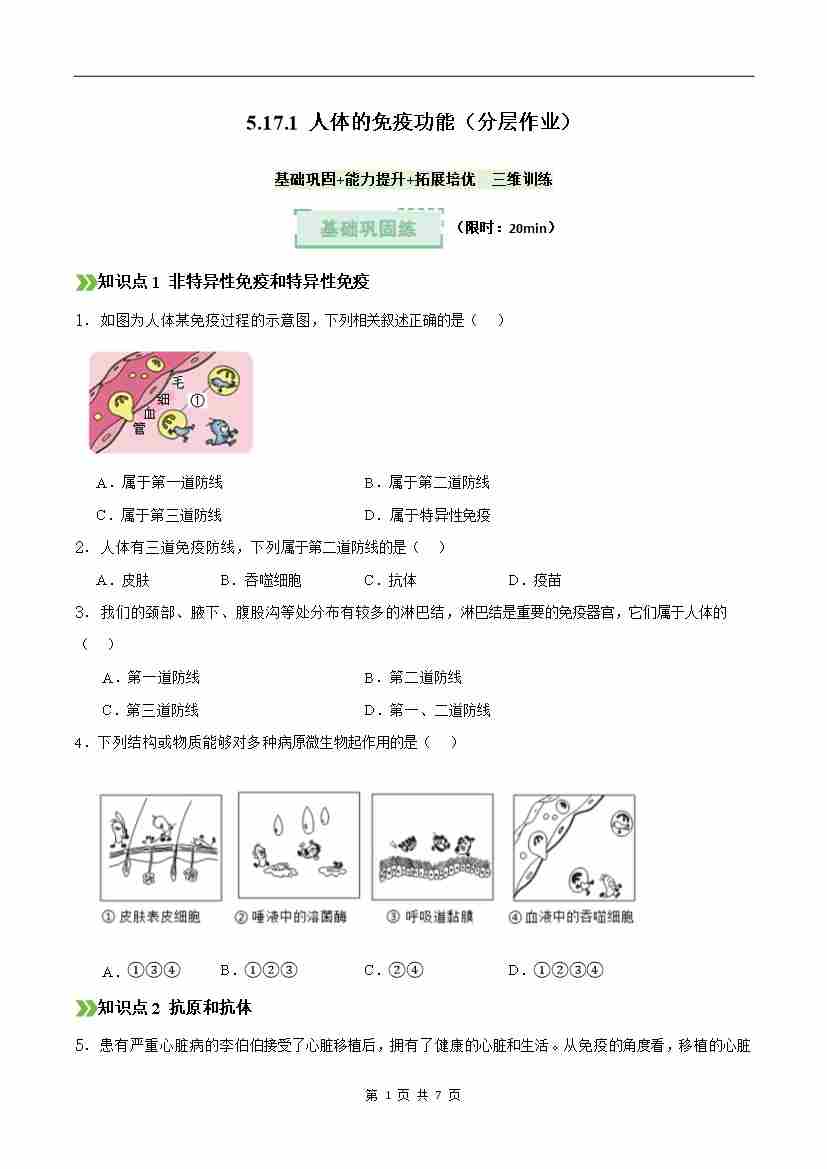 5.17.1 人体的免疫功能(分层作业)(原卷版)