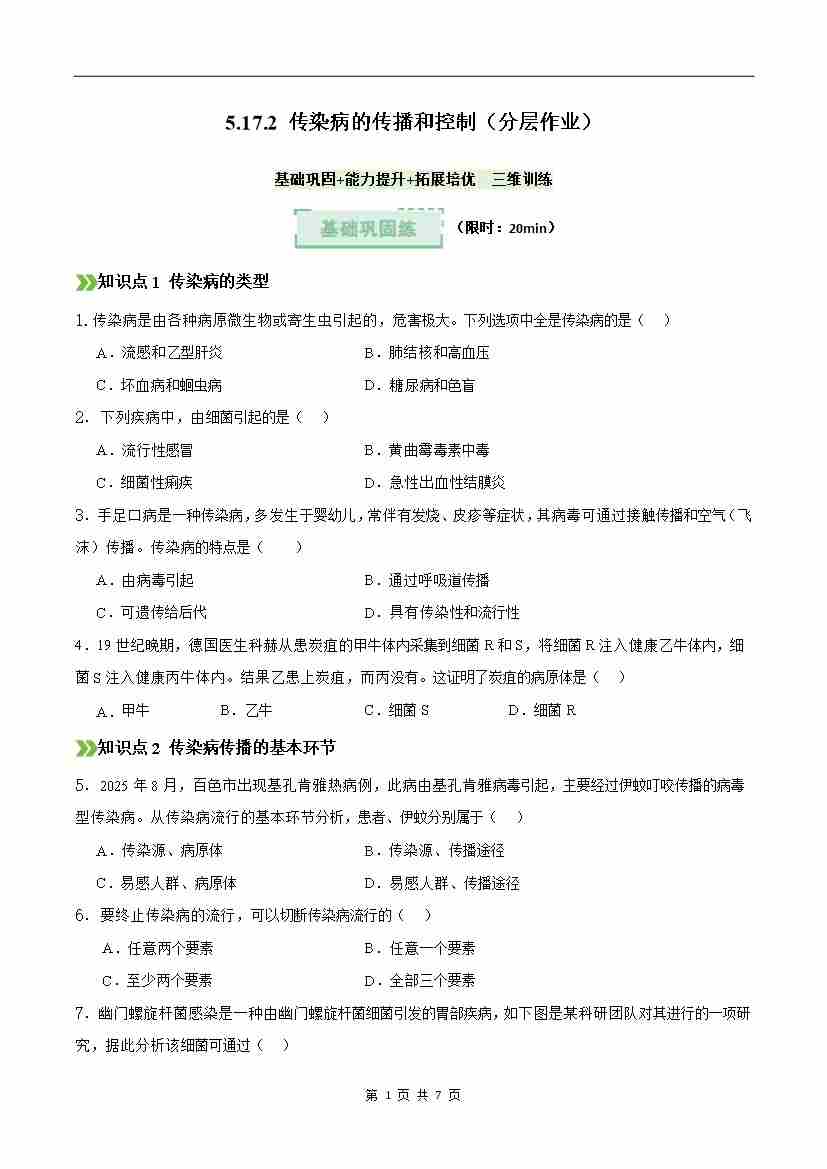 5.17.2 传染病的传播和控制(分层作业)(原卷版)