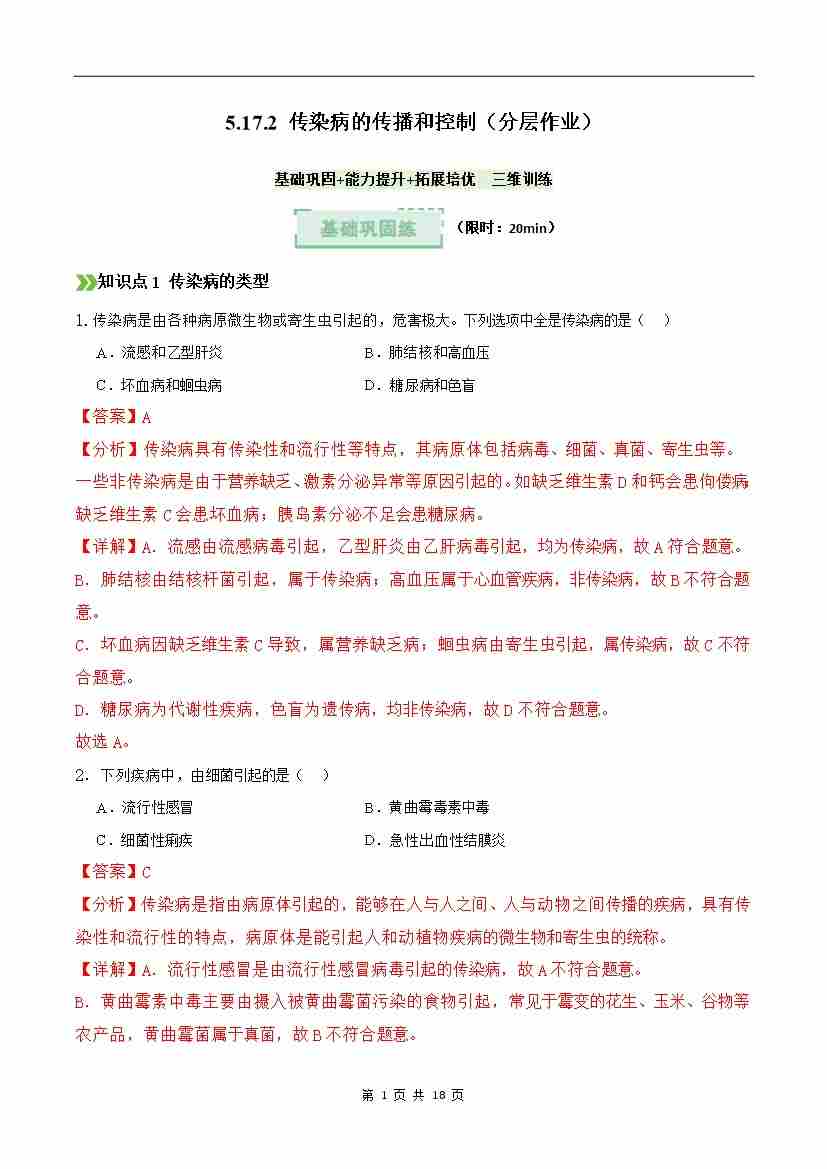 5.17.2 传染病的传播和控制(分层作业)(解析版)
