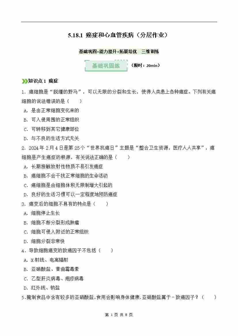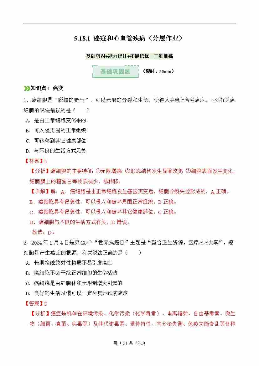 5.18.1 癌症和心血管疾病(分层作业)(解析版)