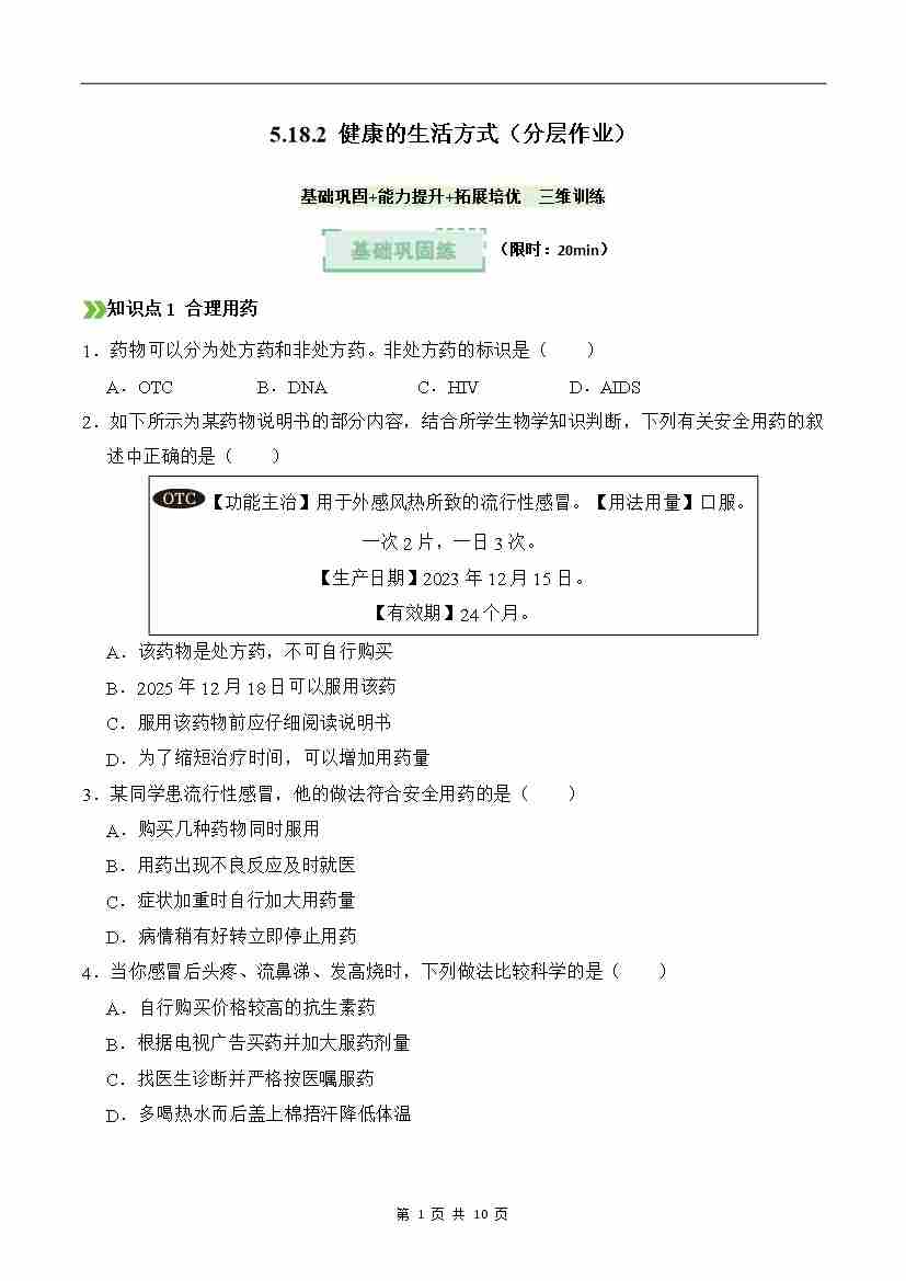 5.18.2 健康的生活方式(分层作业)(原卷版)
