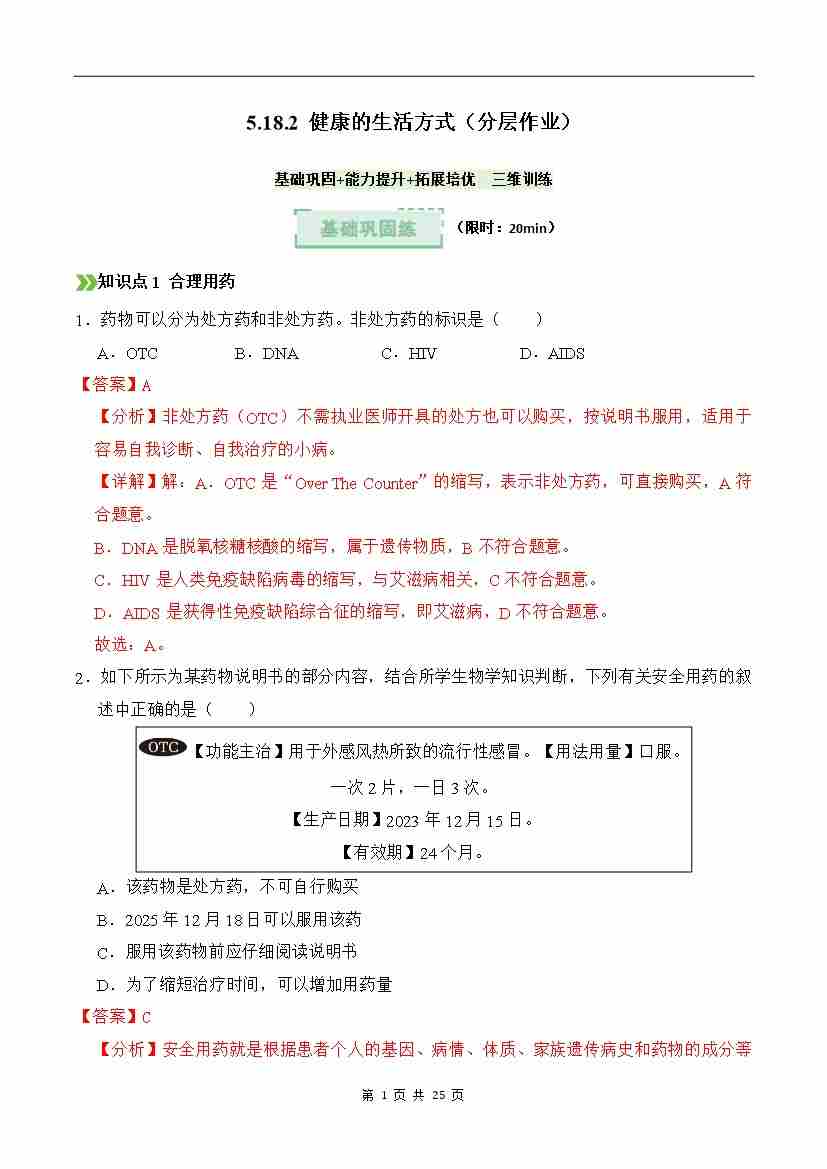 5.18.2 健康的生活方式(分层作业)(解析版)