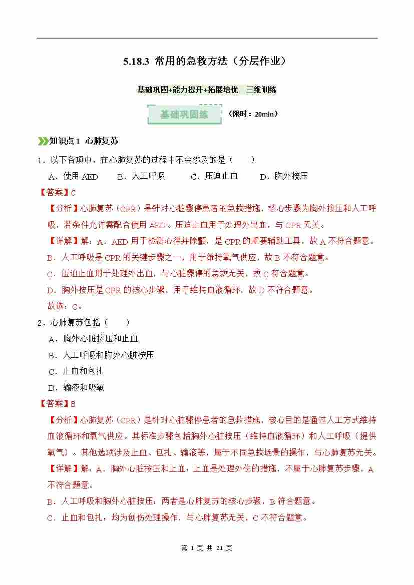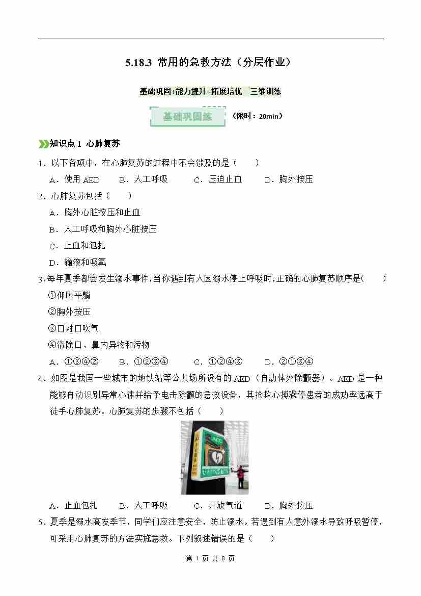 5.18.3 常用的急救方法(分层作业)(解析版)