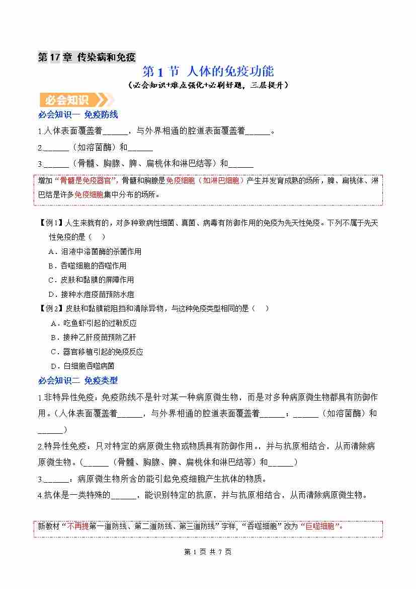 5.17.1人体的免疫功能(提升讲义)生物苏教版2024八年级下册(原卷版)