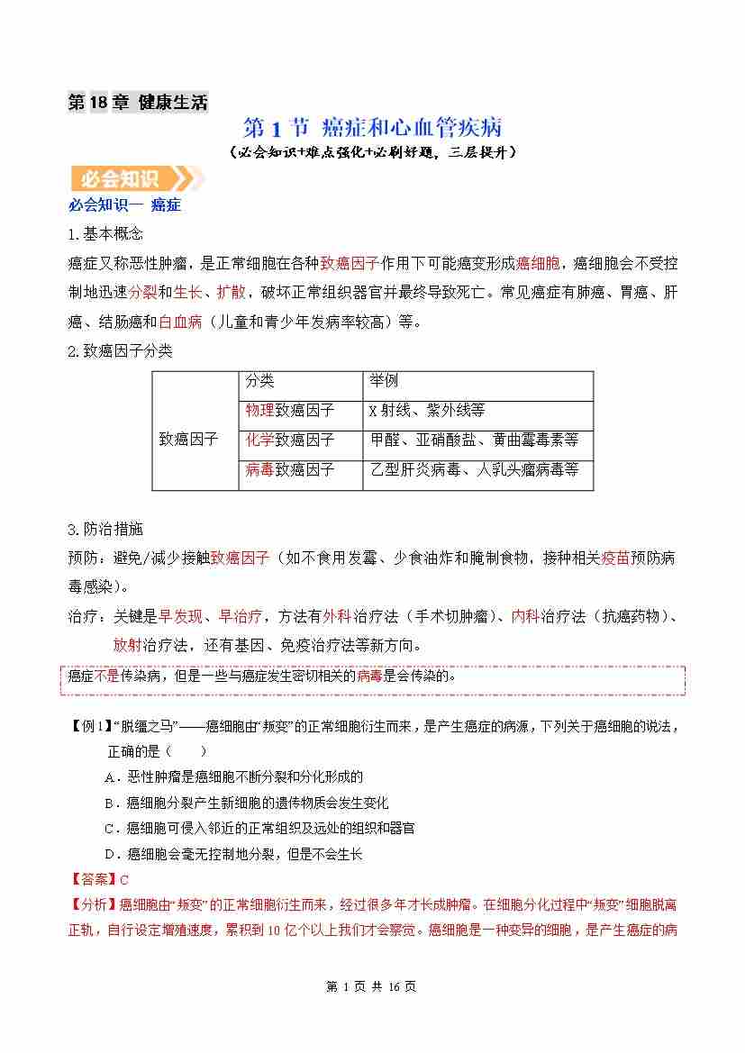 5.18.1癌症和心血管疾病(提升讲义)生物苏教版八年级下册(解析版)