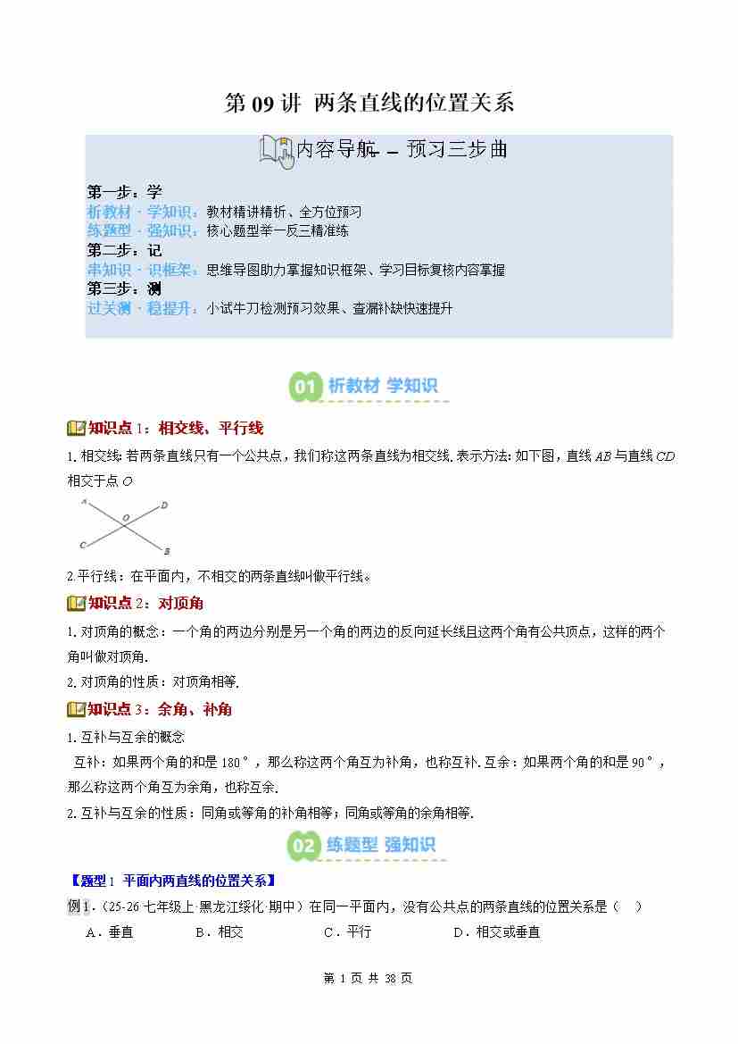 ②寒假预习-第09讲 两条直线的位置关系(3知识点8大题型过关测)(教师版)-2026年七年级数学寒假衔接讲练 (北师大版-新教材)