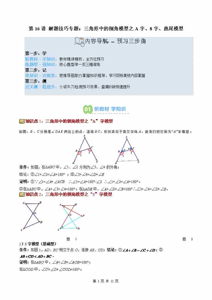 ②寒假预习-第16讲 解题技巧专题:三角形中的倒角模型之A字、8字、燕尾模型(3知识点3大题型过关测)(学生版) (北师大版-新教材)