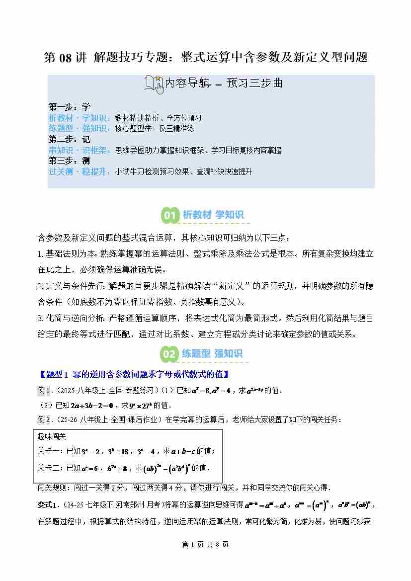 ②寒假预习-第08讲 解题技巧专题:整式运算中含参数及新定义型问题(3知识点7大题型过关测)(学生版)-2026年七年级数学寒假衔接讲练 (北师大版-新教材)