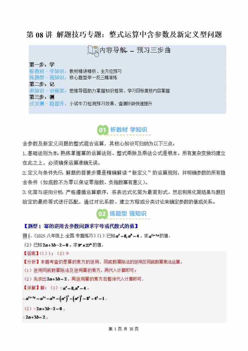 ②寒假预习-第08讲 解题技巧专题:整式运算中含参数及新定义型问题(3知识点7大题型过关测)(教师版)-2026年七年级数学寒假衔接讲练 (北师大版-新教材)
