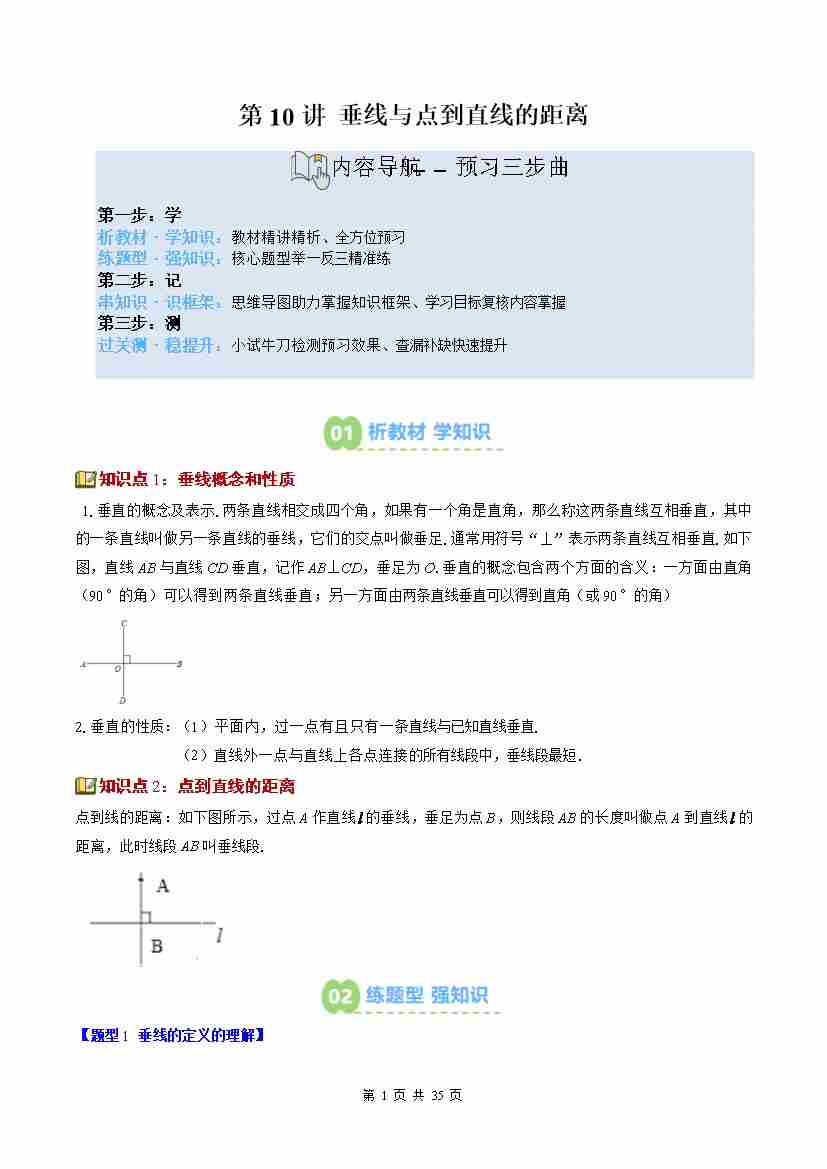 ②寒假预习-第10讲 垂线与点到直线的距离(2知识点6大题型过关测)(教师版)-2026年七年级数学寒假衔接讲练 (北师大版-新教材)