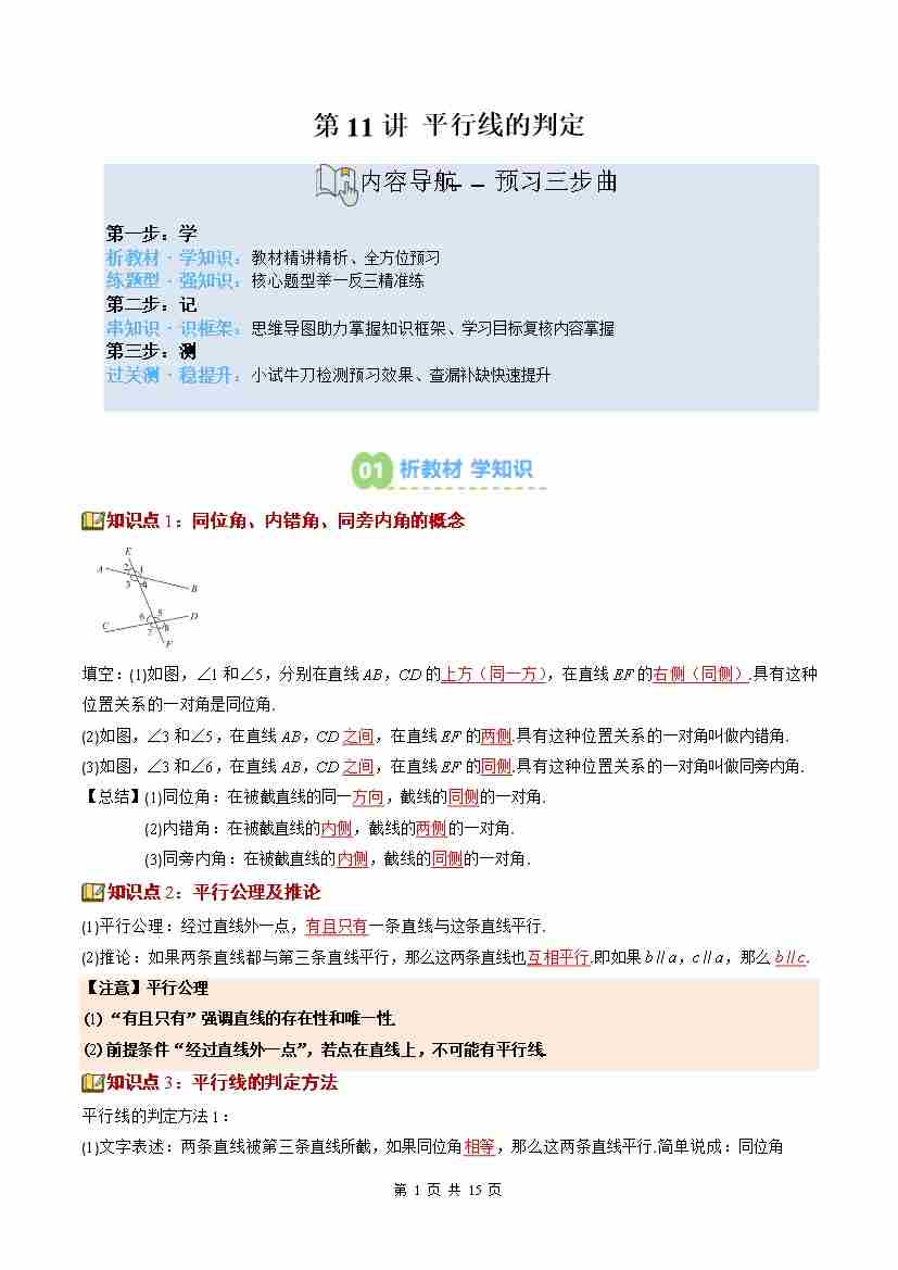 ②寒假预习-第11讲 平行线的判定(3知识点8大题型过关测)(教师版)-2026年七年级数学寒假衔接讲练 (北师大版-新教材)