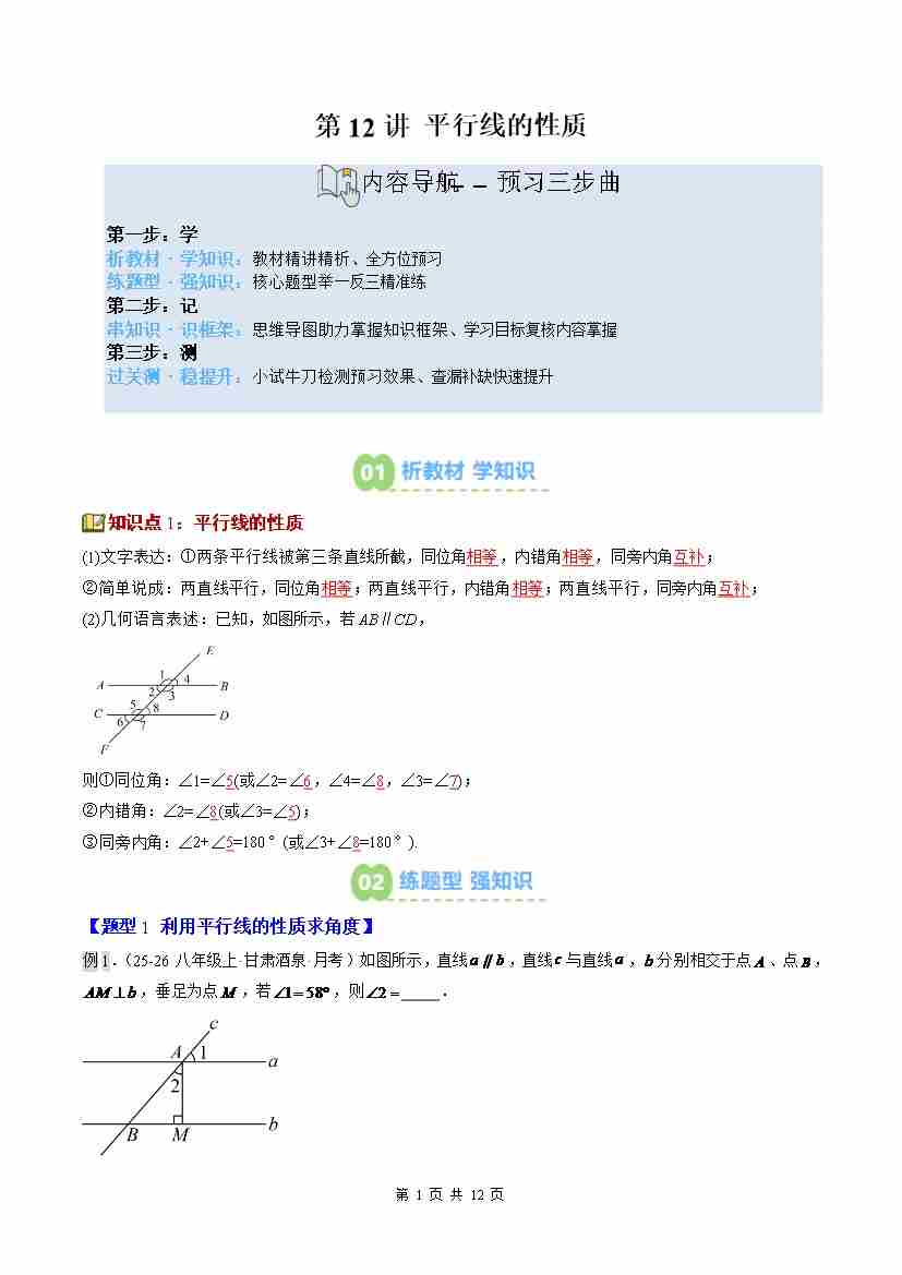 ②寒假预习-第12讲 平行线的性质(1知识点5大题型过关测)(学生版)-2026年七年级数学寒假衔接讲练 (北师大版-新教材)