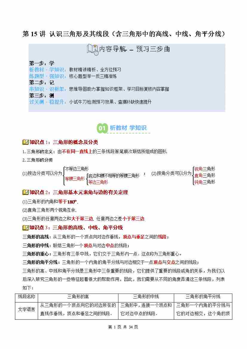②寒假预习-第15讲 认识三角形及其线段(含三角形中的高线、中线、角平分线)(3知识点8大题型过关测)(教师版) (北师大版-新教材)