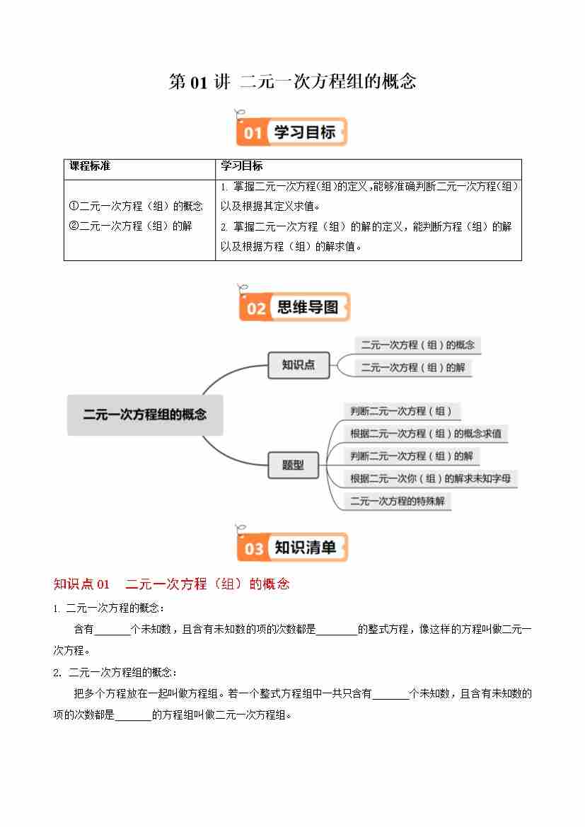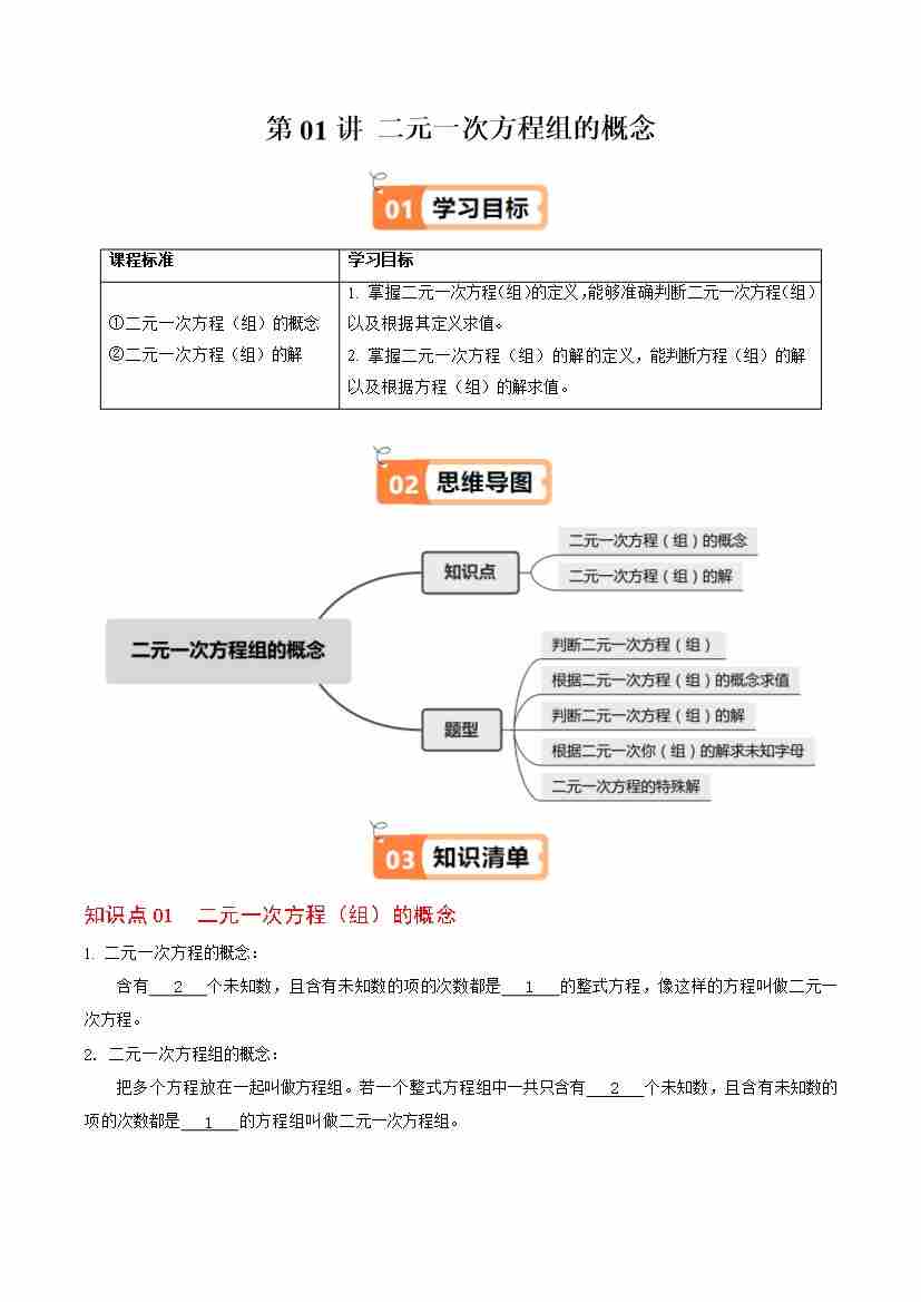 第01讲 二元一次方程组的概念(2个知识点5类热点题型讲练习题巩固)(学生版)