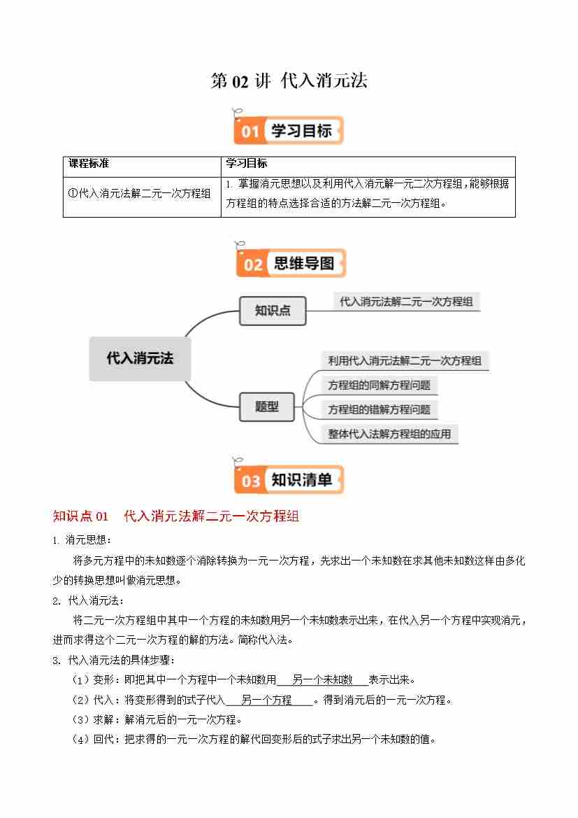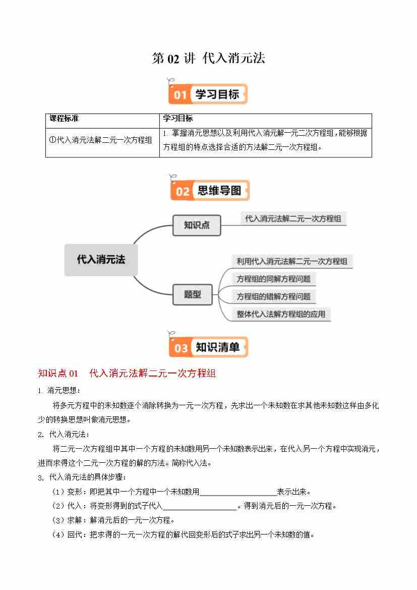 第02讲 代入消元法(1个知识点4类热点题型讲练习题巩固)(学生版)