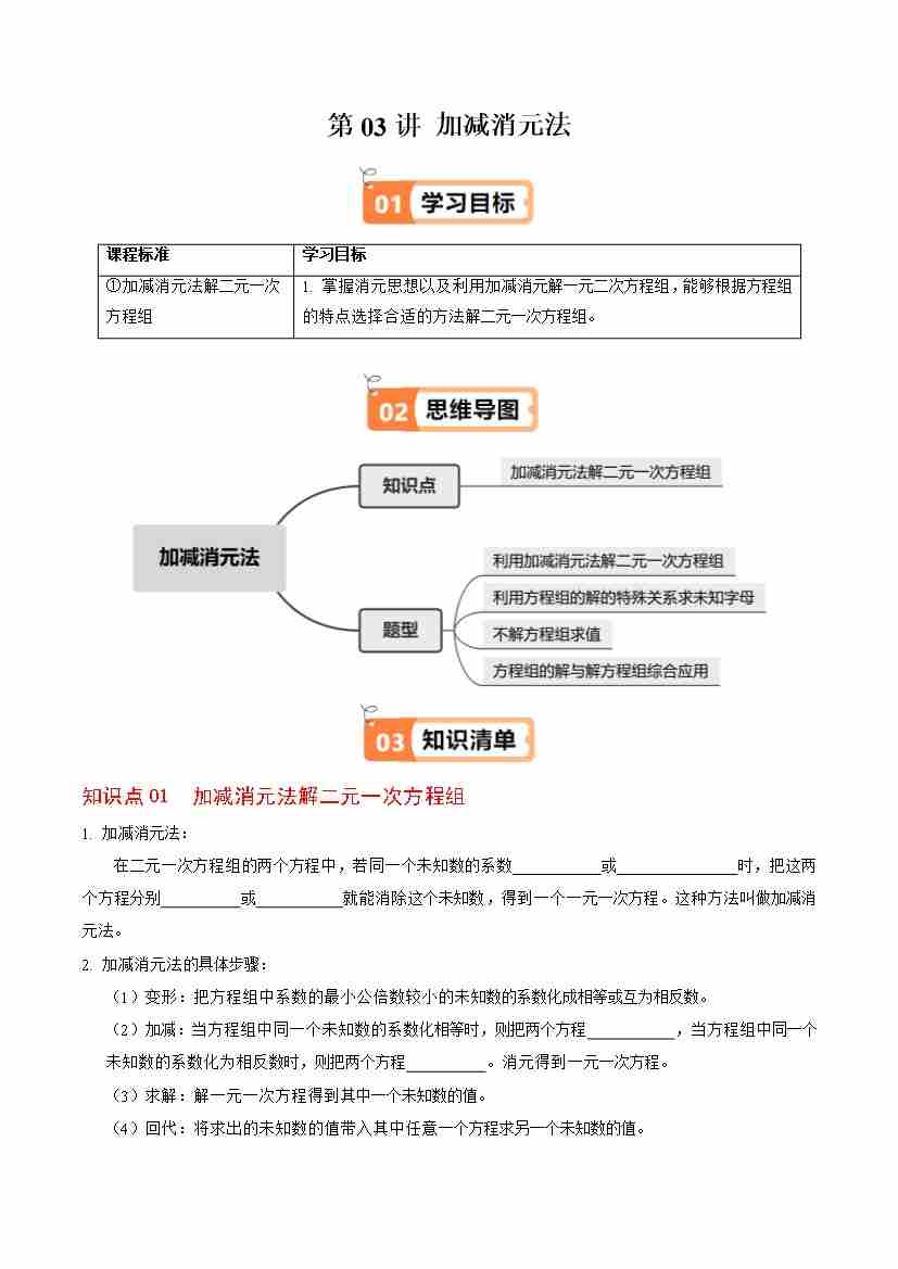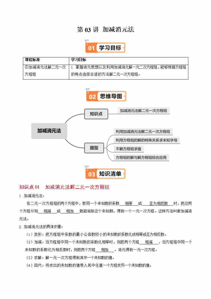 第03讲 加减消元法(1个知识点4类热点题型讲练习题巩固)(学生版)